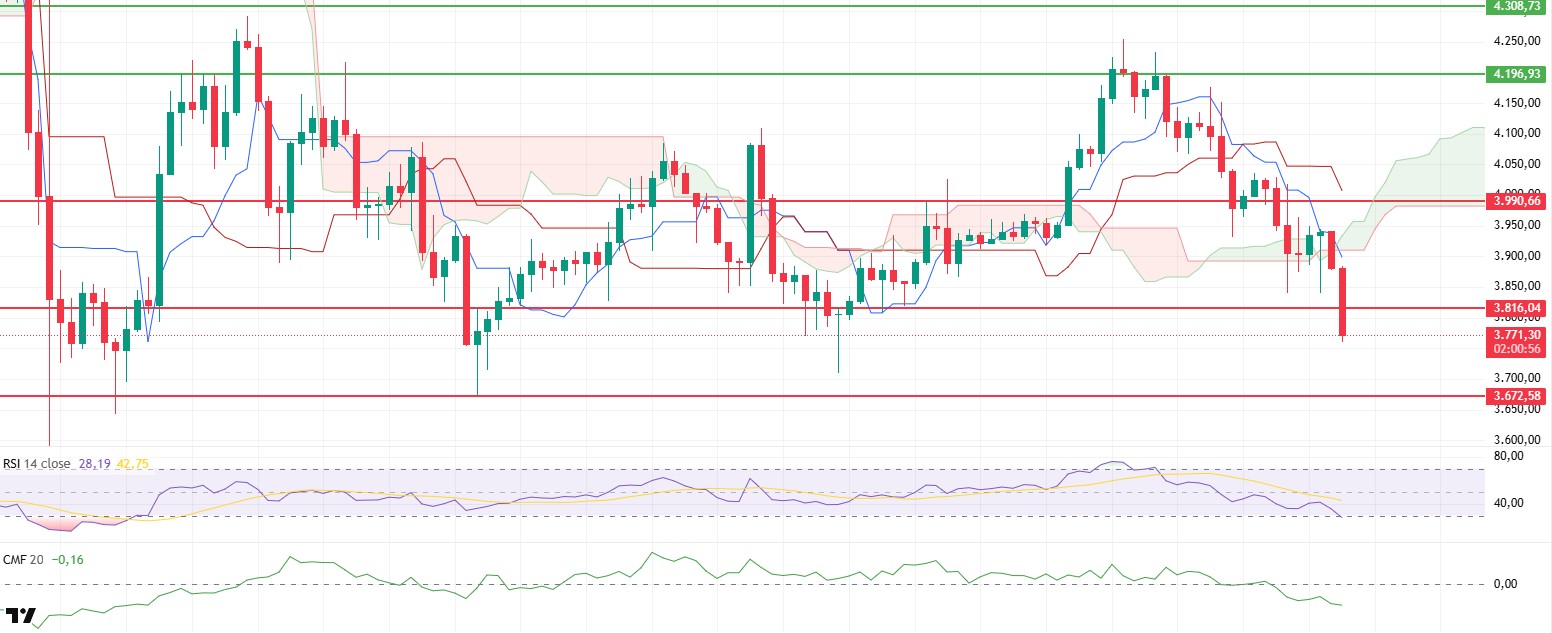 The technical outlook is generally negative. If the price fails to regain the $3,816 level in the evening hours, the downward movement is expected to continue. In this case, there is a risk of the price retreating to the $3,672 level. On the other hand, if the price manages to stay above $3,816, a short-term recovery is possible, and the price may target the lower band of the kumo cloud at $3,912 again. Looking at the overall picture, selling pressure on Ethereum remains strong. However, due to entering the oversold zone, short-term rebound buying may be seen. Nevertheless, as the trend direction is downward, any rallies may remain limited for now.