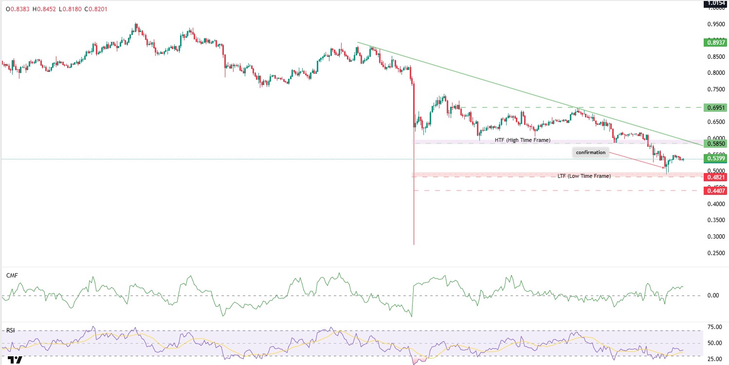 As of today, the Bitcoin price remained above $103,000, completing its pullback movement. Statements by FED members during the day and the narrowing of volatility may lead to increased selling pressure. In this scenario, the price intersects with the confirmation zone, which is the entry zone of the lower time frame (LTF), at the $0.4821 level. This technically increases the importance of the region. In a more severe correction scenario, the $0.4407 level can be monitored as the main support level. However, confirmation of this movement should be monitored in terms of volume and market structure.
