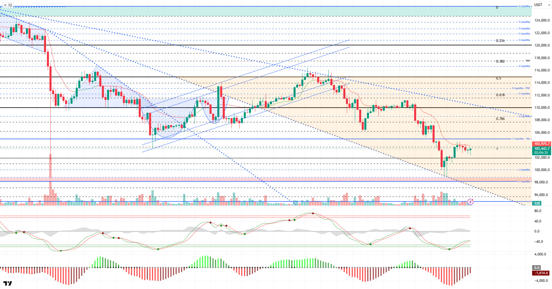 In summary, while the effects of the US-China tariff crisis being suspended for a year and resulting in a compromise continue, optimistic developments continue to emerge from both sides. However, the Fed’s hawkish tone on interest rate cuts continues to put pressure on the market, while the uncertainty caused by the US government shutdown persists. On the technical side, although BTC recorded short-term increases from time to time, it touched the lower trend line parallel to the descending trend channel it formed. In liquidity data, while the dominance of the selling tier continues, buyers are beginning to reappear. In the coming period, 103,300 will be monitored as a resistance point, and if this level is gained, the 105,000 reference area and then the 105,600 liquidity zone can be monitored.In the event of a potential new selling pressure, 101,800 is the first support point, and if broken, we will follow the 100,000 reference area.