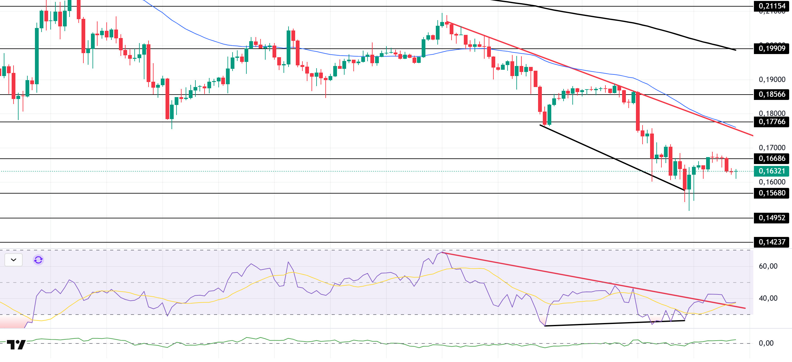 The DOGE price traded sideways during the day. The asset remained below the downward trend that began on October 27. It tested the $0.16686 level as resistance and deepened its pullback. The price, which continues to trade sideways, may test the $0.15680 level if the pullback continues. If an uptrend begins, it may test the 50 EMA (Blue Line) moving average as resistance.