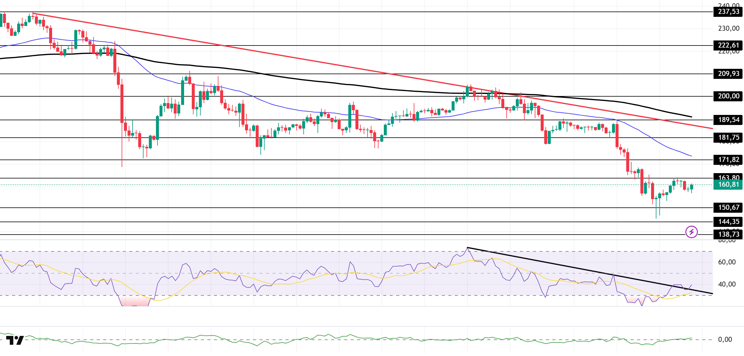 The price remained below the 50 EMA (Exponential Moving Average – Blue Line) and 200 EMA (Black Line) on the 4-hour chart. This indicates a potential downtrend in the medium term. Additionally, the price being below both moving averages suggests a downward trend in the short term. The Chaikin Money Flow (CMF-20) is rising to positive levels. However, a decrease in cash inflows could push the CMF into negative territory. The Relative Strength Index (RSI-14) has risen to the middle of the negative zone. It is also testing the resistance level of the downward trend that began on October 27. A break above this level could lead to an uptrend. If there is an uptrend due to macroeconomic data or positive news related to the Solana ecosystem, the $171.82 level stands out as a strong resistance point. If this level is broken upwards, the uptrend is expected to continue. If there are pullbacks due to developments in the opposite direction or profit-taking, the $144.35 level may be tested. A decline to these support levels could increase buying momentum, presenting a potential opportunity for an upward move.