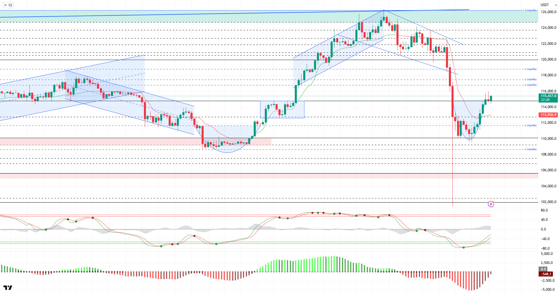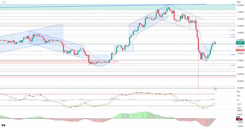 Looking at the technical picture, last week BTC gave short-term weakening signals with the flag formation it created around its all-time high (ATH). Following this technical structure, the price experienced a sharp pullback with the loss of the $119,000 level, the lower band of the minor downtrend. Influenced by fundamental factors, the price spiked down to the $101,500 level. However, it rebounded strongly from this area and quickly recovered. BTC spent the weekend in the $110,000–$113,000 range and gained upward momentum again with the new week, breaking above the critical $115,000 resistance level.