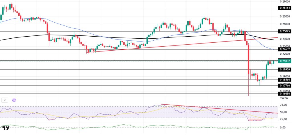 The DOGE price experienced a pullback. The asset moved into the lower region of the upward trend that began on September 25. The price, which faced resistance from the 50 EMA (Blue Line) moving average, fell approximately 28% from there. The asset, which began to rise with support at the $0.17766 level, is currently testing the strong resistance level of $0.21154. If it breaks above this level and the uptrend continues, it could test the $0.22632 level. In the event of a pullback, the $0.19909 level should be monitored.