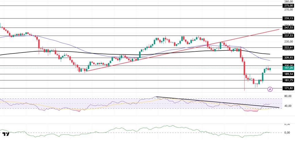 On the 4-hour chart, the price has started to move below the 50 EMA (Exponential Moving Average – Blue Line) and 200 EMA (Black Line). This indicates a possible downtrend in the medium term. At the same time, the price being below both moving averages shows us that the asset is in a downtrend in the short term. The Chaikin Money Flow (CMF-20) is at a neutral level. However, a decrease in money inflows could push the CMF into negative territory. The Relative Strength Index (RSI-14) broke above the downward trend that began on October 2 but remains in negative territory. An upward breakout could create upward pressure. In the event of an uptrend driven by macroeconomic data or positive news related to the Solana ecosystem, the $209.93 level stands out as a strong resistance point. If this level is broken upward, the uptrend is expected to continue. In the event of pullbacks due to developments in the opposite direction or profit-taking, the $181.75 level could be tested. A decline to these support levels could increase buying momentum, presenting a potential opportunity for an upward move.