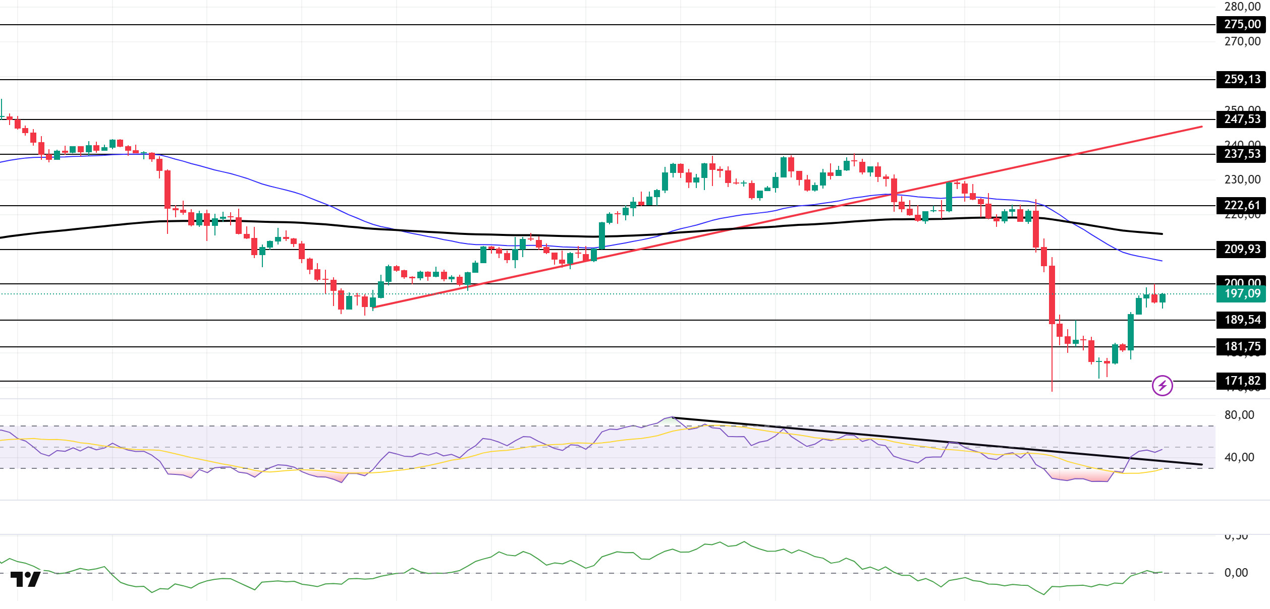 The SOL price experienced a decline. The asset continues to be in the lower region of the upward trend that began on September 26. The price, which faced resistance from the 50 EMA (Blue Line) moving average, fell approximately 23% from there, found support at the strong support level of $171.82, and showed a slight increase. The price, which continues to be in the lower region of the upward trend, is currently facing resistance at the $200.00 level. If the rise continues, it may test the $209.93 level , and the 50 EMA moving average as resistance. If the pullback begins, the $181.75 level can be monitored.