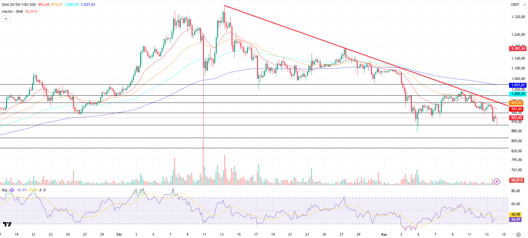 Technical indicators for BNB, currently trading in the $900–940 range, show that the low trading volume in recent periods has limited the positive outlook. Furthermore, it is observed that the current volume levels are not strong enough to break the downward trend. In addition, the Relative Strength Index (RSI) indicator has shown a renewed downward trend due to weak momentum.