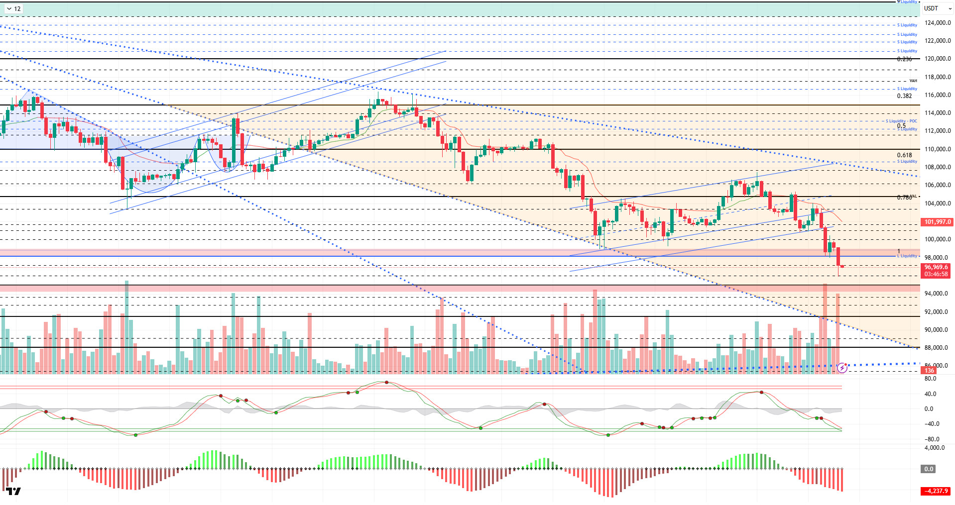 From a technical perspective, BTC was testing the 103,300 level within the minor uptrend channel mentioned in previous analyses, but faced heavy selling pressure due to the developments mentioned above and lost six-figure levels. The price fell to the 98,000 level after losing the 101,800 and 100,000 support points, respectively. Although it subsequently surpassed the 100,000 level again, it was unable to sustain it, spiking to the 96,000 level and exhibiting high volatility. At the time of writing, the price continues to trade at the 97,200 level, seeking equilibrium.