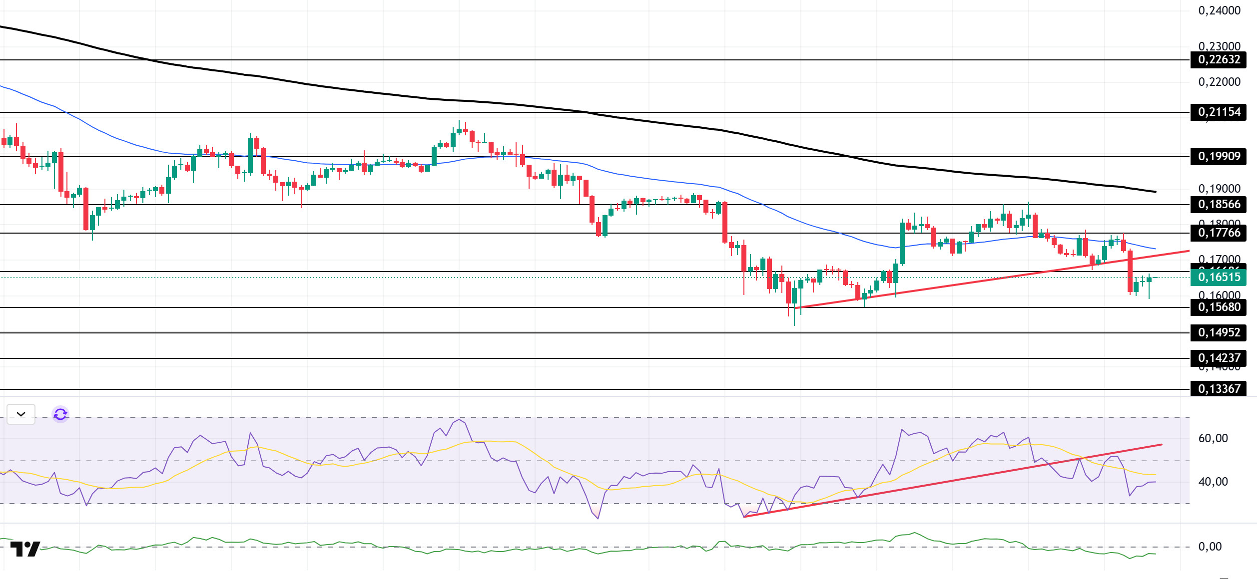 DOGE price has declined. The asset broke below the upward trend that began on November 4 with a strong bearish candle, continuing its decline and remaining below this trend. The asset, which faced resistance from the 50 EMA (Blue Line) moving average, lost approximately 8% in value. The price is currently experiencing a slight uptick. If the uptrend continues, it may test the 50 EMA (Blue Line) moving average as resistance. If the pullback continues, the $0.14952 level may act as support.
