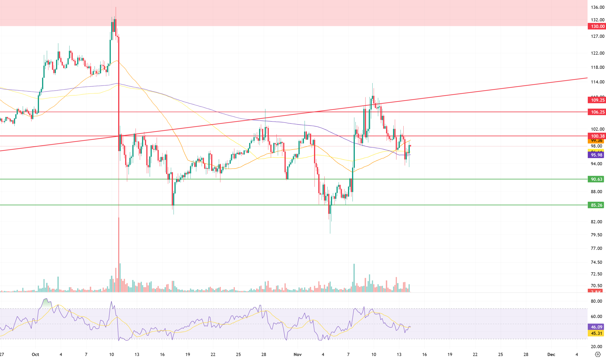 Technically, examining Litecoin’s 4-hour USDT pair chart, the fact that it continues above the 200 and 100-period moving averages, but below the 50-period moving average and also below the rising trend, indicates a downward expectation, along with more short positions in the derivatives market. However, upward movements are also possible. If this possibility materializes, the first point where the rise could be suppressed is the 100.38 level, which is an important level that will create selling pressure at the horizontal resistance. Subsequently, it encounters another intraday horizontal resistance at 106.25. Finally, it should not be overlooked that short positions may increase partially if the price reaches the lower band of the rising trend, currently at 109.25.