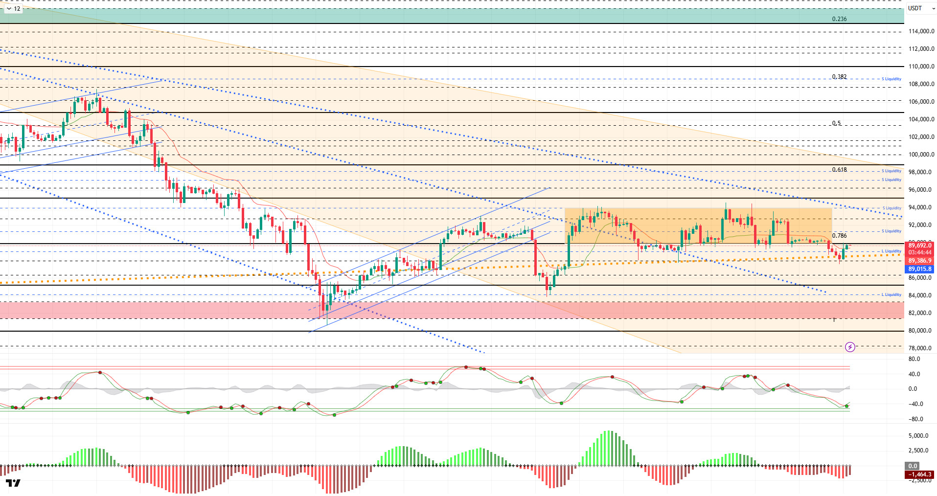 Technical indicators show that the Wave Trend (WT) oscillator has returned to the oversold zone after the recent decline, generating a buy signal. The histogram on the Squeeze Momentum (SM) indicator is attempting to gain momentum within the negative zone. The Kaufman Moving Average (KAMA) is currently trading below the price at the $89,380 level.