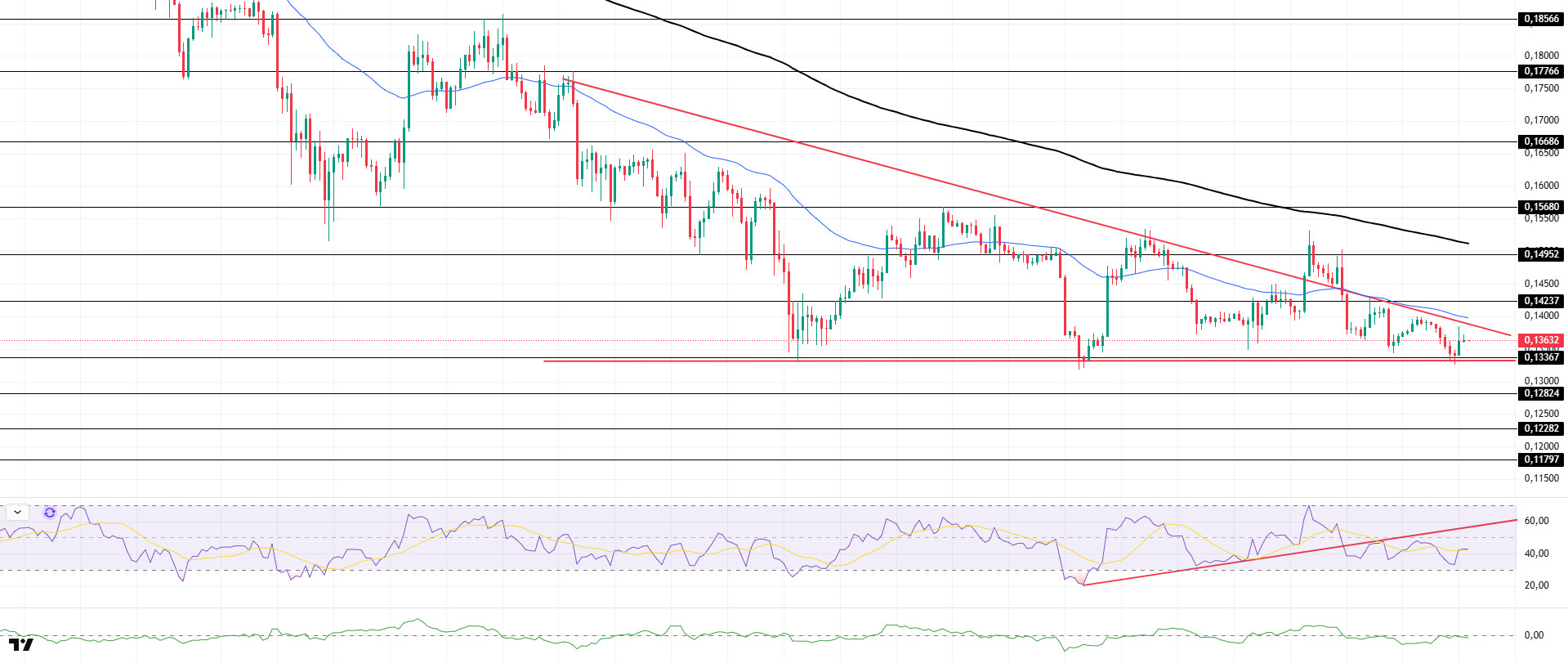 The DOGE price continued its sideways movement. The asset gained slight momentum by finding support at the base level of the descending triangle formation that began on November 13. Currently preparing to test the ceiling level of the descending triangle formation and the 50 EMA (Blue Line) moving average as resistance, the price may test the 200 EMA (Black Line) moving average as resistance if the uptrend continues. If a pullback begins, it may retest the base level of the descending triangle formation.