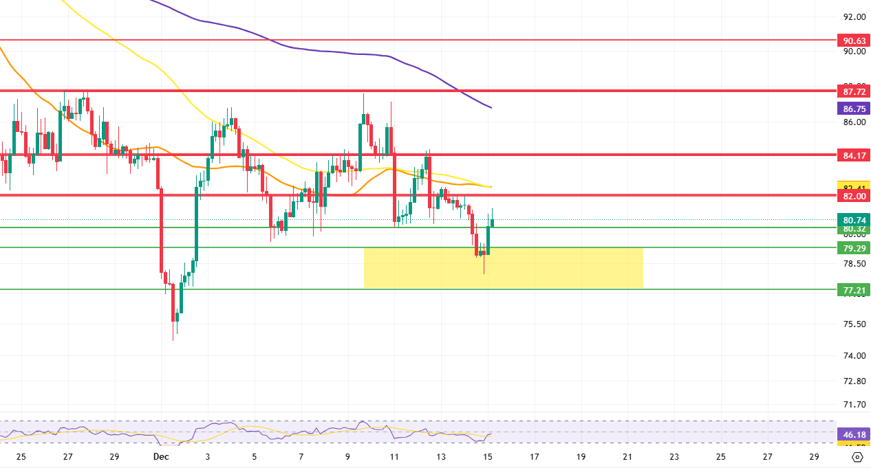 If a pullback movement in line with expectations occurs, the first support level to watch is 80.32. If the downward movement continues, the support levels of 79.29 and 77.21 will come into play. The levels of 79.29 and 77.21 are technically strong support areas as they correspond to the Fibonacci 0.618 and 0.786 retracement levels on the 4-hour chart. Although the reaction previously observed from this area (yellow zone) was strong and healthy, it should be noted that if the price retreats back to the same zone in the short term, the reaction may not be as strong as before.