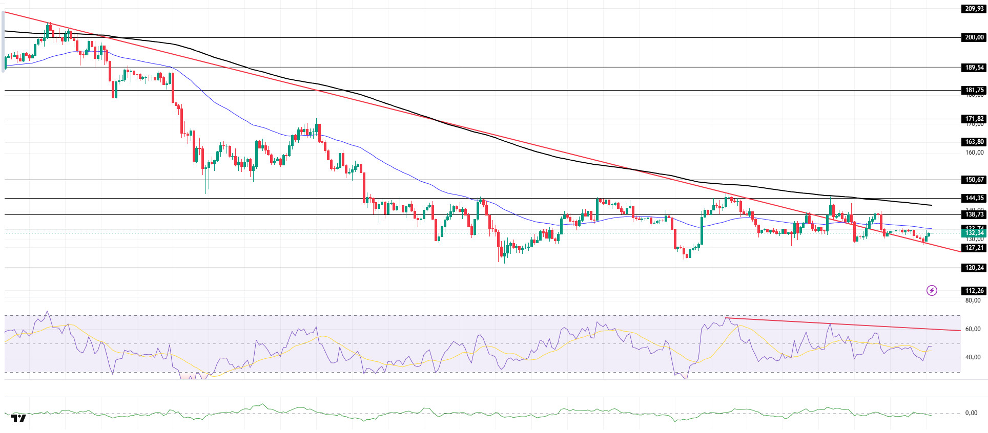 On the 4-hour chart, it remained below the 50 EMA (Exponential Moving Average – Blue Line) and 200 EMA (Black Line). This indicates a possible downtrend in the medium term. At the same time, the price being below both moving averages signals a downward trend for the asset in the short term. The Chaikin Money Flow (CMF-20) has moved into negative territory. However, the balance of money inflows and outflows may keep the CMF in negative territory. The Relative Strength Index (RSI-14) rose to near the neutral level of the negative zone. At the same time, it remained below the downward trend line that began on December 3. This signaled selling pressure. If there is an uptrend due to macroeconomic data or positive news related to the Solana ecosystem, the $150.67 level stands out as a strong resistance point. If this level is broken upwards, the uptrend is expected to continue. If there are pullbacks due to developments in the opposite direction or profit-taking, the $120.24 level could be tested. A decline to these support levels could increase buying momentum, presenting a potential opportunity for an upward move.
