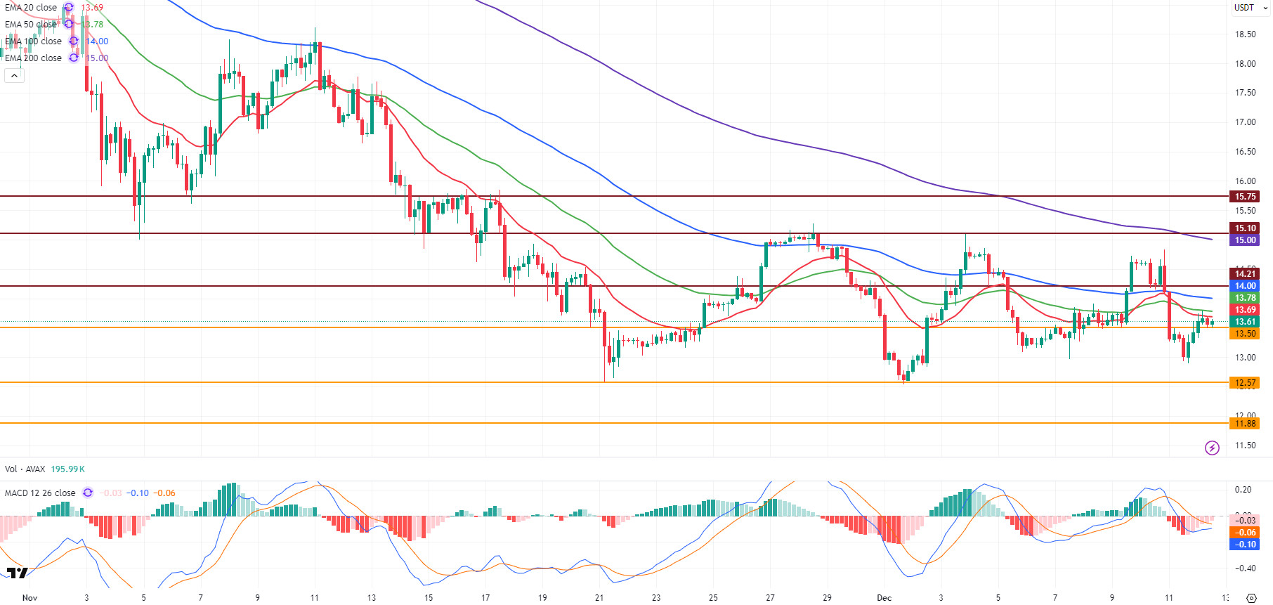 From a technical perspective, the first critical resistance zone for AVAX’s rise is the $14.21 level, along with the band formed by the EMA levels. If this region is broken upwards, the upward momentum could accelerate, and AVAX could move towards and test the EMA200, $15.10, and $15.75 resistance levels. In a downward scenario, the $13.50 level is the first important support position. If this level is broken downward again, selling pressure may increase, and AVAX may retreat towards the $12.57 and $11.88 support levels. In the overall outlook, the MACD remaining in negative territory and AVAX trading below all critical EMA levels indicates a cautious short-term outlook. Although there have been rebound purchases during the day, as long as sustainability above the EMA levels is not achieved, upward attempts are likely to remain limited in the resistance zones.