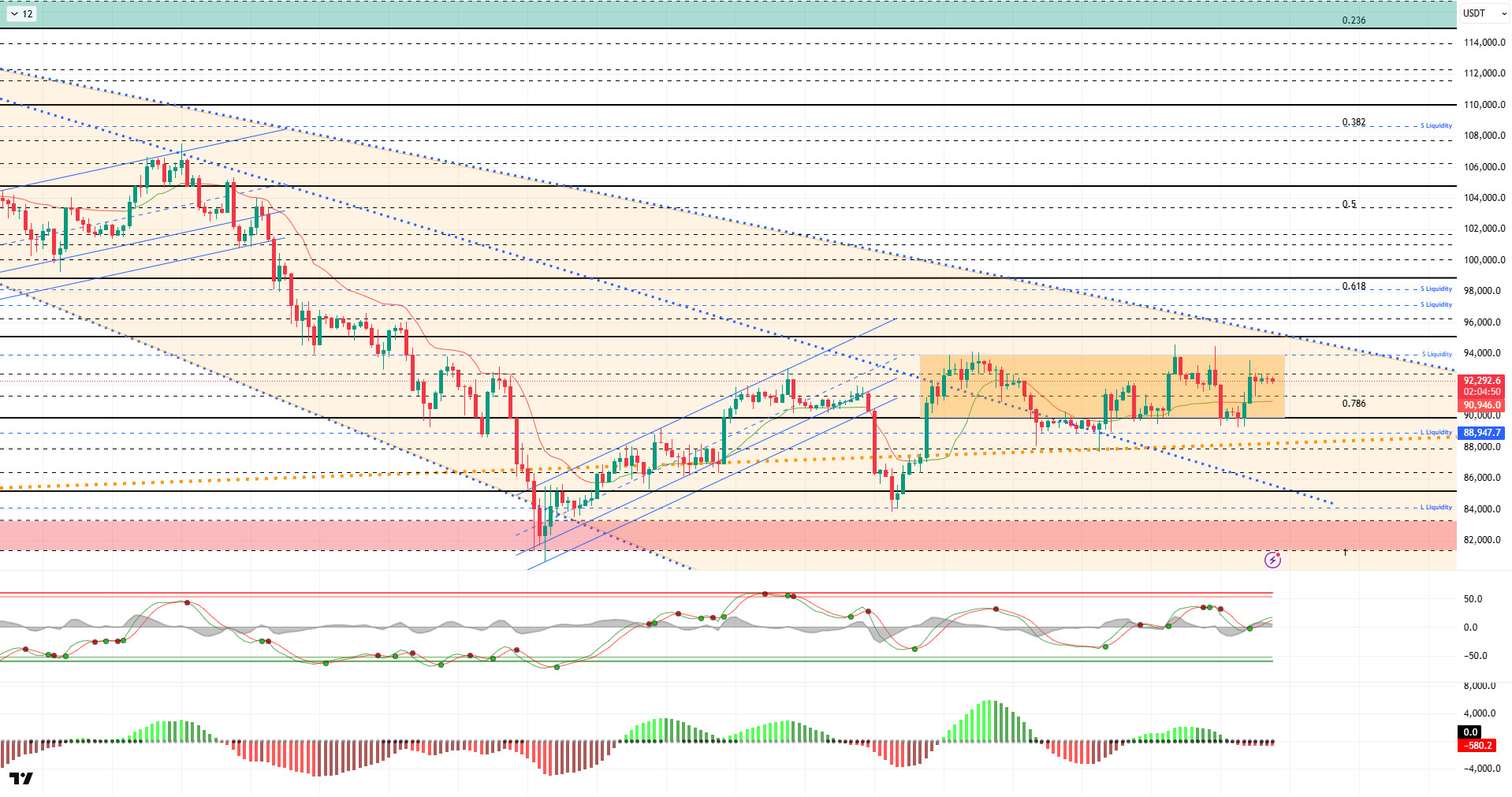 From a technical perspective, BTC entered a consolidation phase within a horizontal band after losing its triangle structures in the previous analysis. The price, which occasionally spikes below the reference level of 90,000, manages to break above this region. Yesterday, the price once again demonstrated a similar movement, returning above the 92,000 level.