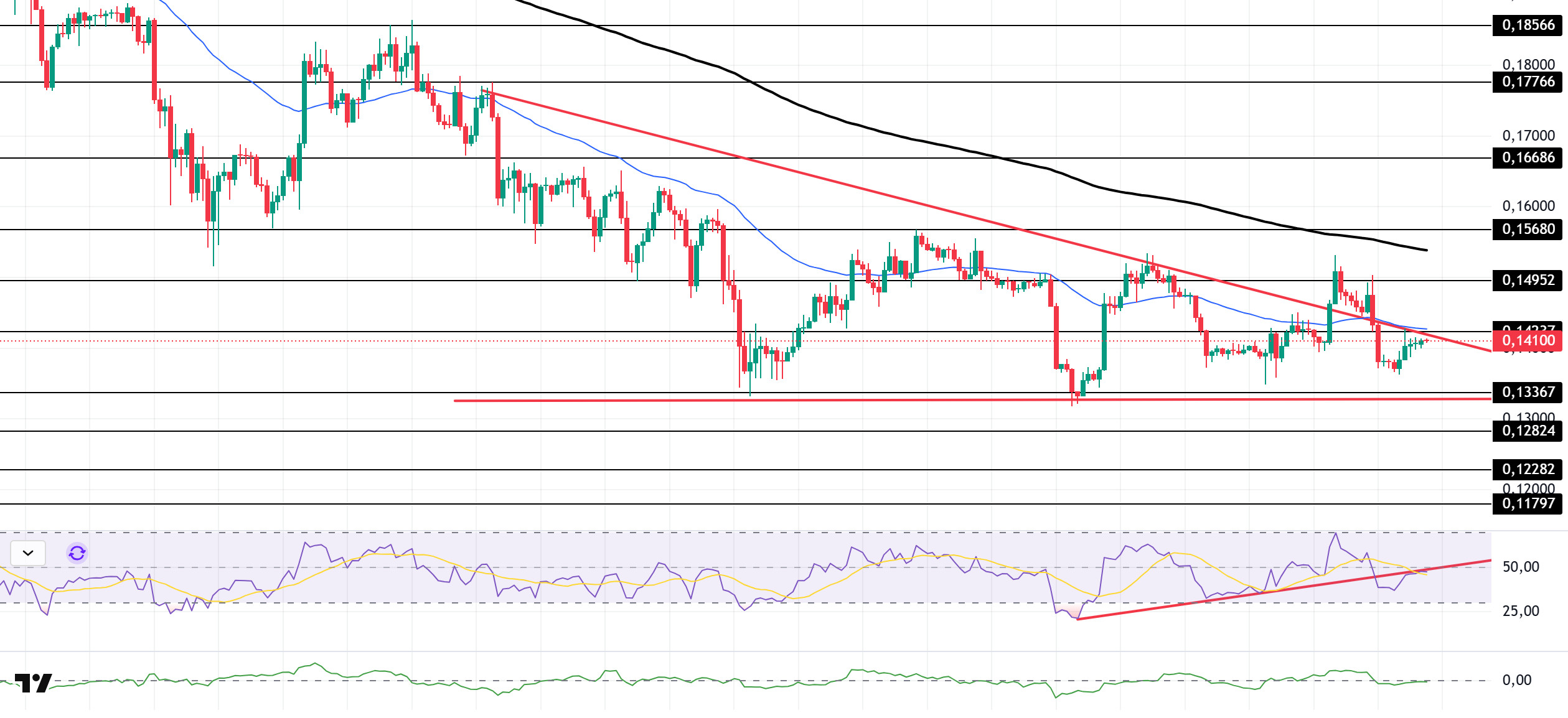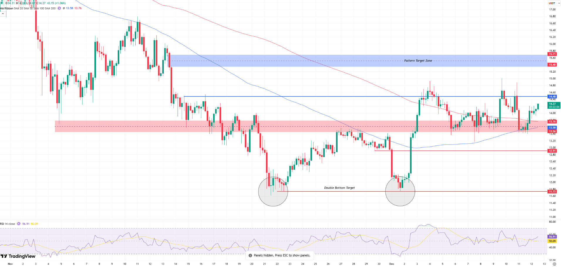 The main threshold the market must overcome for the upward movement to gain strength is the 14.45–14.48 resistance band. Although the price has tested this level several times in recent days, there has not yet been a breakout that proves the dominance of buyers. Four-hour closes above this area will only bring the target zone of the double bottom pattern back into focus. In particular, a market structure forming above 15.40 could significantly shift the medium-term trend picture to positive.