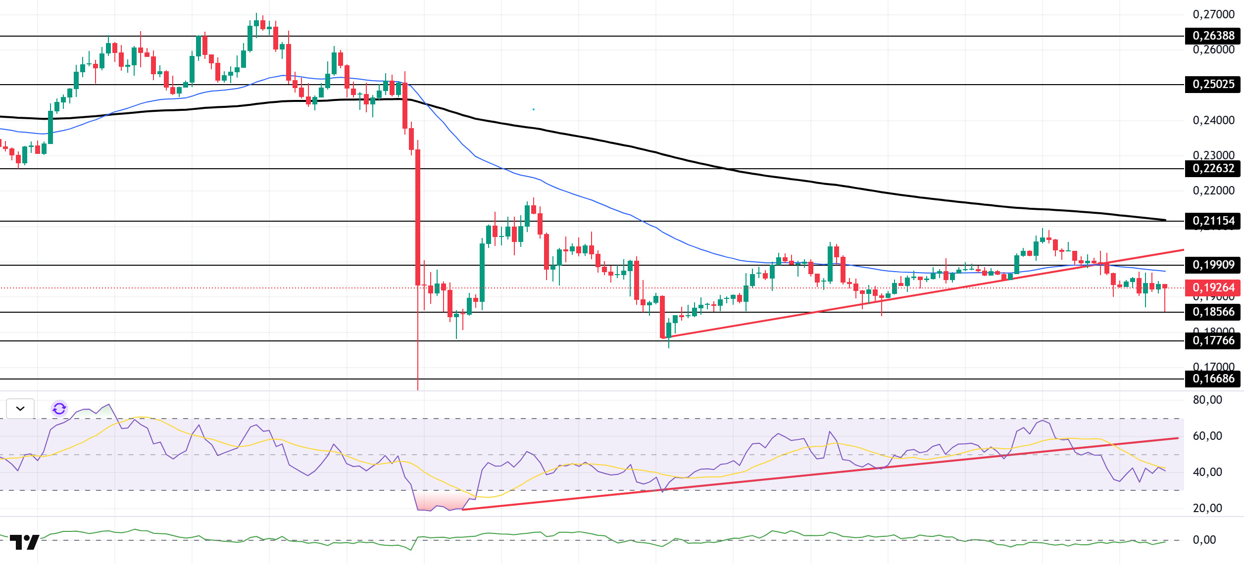 The DOGE price experienced a slight decline. The asset moved into the lower region of the upward trend that began on October 17. This signaled increased downward pressure. Currently, the asset, supported by the strong support level of $0.18566, experienced a slight increase and is preparing to test the 50 EMA (Blue Line) moving average as resistance. If the increase continues, it may test the rising trend as resistance. In case of a pullback, it may test the $0.17766 level.