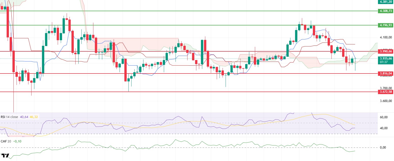 The technical outlook generally points to a cautious stance. The upper band of the kumo cloud at the $3,928 level stands out as a critical short-term support. If the price remains above this level, a rebound towards the $3,990 resistance could be seen. However, if the price closes below the $3,928 level, selling pressure may increase, and the price may retreat to the $3,850 – $3,800 range. In summary, although Ethereum is showing a weak outlook in the short term, it has the potential to maintain its medium-term uptrend as long as it remains above the kumo cloud.
