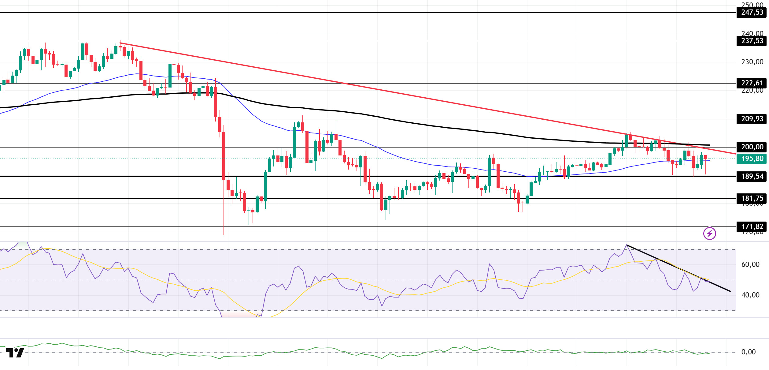 The price remained below the 50 EMA (Exponential Moving Average – Blue Line) and 200 EMA (Black Line) on the 4-hour chart. This indicates a possible downtrend in the medium term. At the same time, the price being below both moving averages shows us that the asset is trending downward in the short term. The Chaikin Money Flow (CMF-20) remained in the negative zone, close to the neutral level. However, the decrease in money inflows could push the CMF deeper into the negative zone. The Relative Strength Index (RSI-14) is in the negative zone. It also remained below the downward trend that began on October 27. This signaled increased selling pressure. If there is an upturn due to macroeconomic data or positive news related to the Solana ecosystem, the $209.93 level stands out as a strong resistance point. If this level is broken upwards, the uptrend is expected to continue. In case of pullbacks due to developments in the opposite direction or profit-taking, the $181.75 level could be tested. A decline to these support levels could increase buying momentum, presenting a potential upside opportunity.