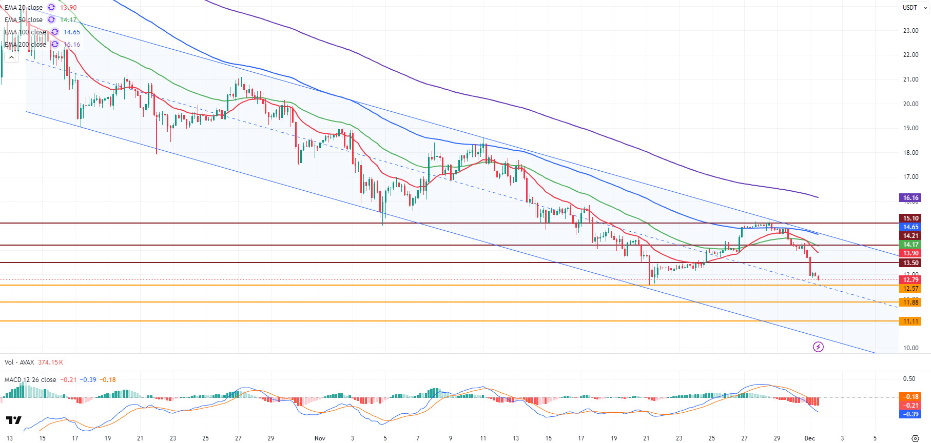 Starting at $13.72 today, AVAX experienced a sharp decline during the day due to the selling pressure seen across the cryptocurrency market. Falling below $13 with today’s decline, AVAX lost approximately 6.6% compared to the opening price. After breaking the $13.50 support level today, selling pressure increased, and the rebound that followed the break was not enough for AVAX to recover. Despite the positive developments seen in the Avalanche ecosystem in recent weeks, the uncertainty and low volume in the market as a whole continued to be decisive for price movements today. Additionally, the short-lived optimism created by expectations of a Fed interest rate cut did not translate into a sustained recovery for AVAX, which continues its downward movement within a bearish channel.