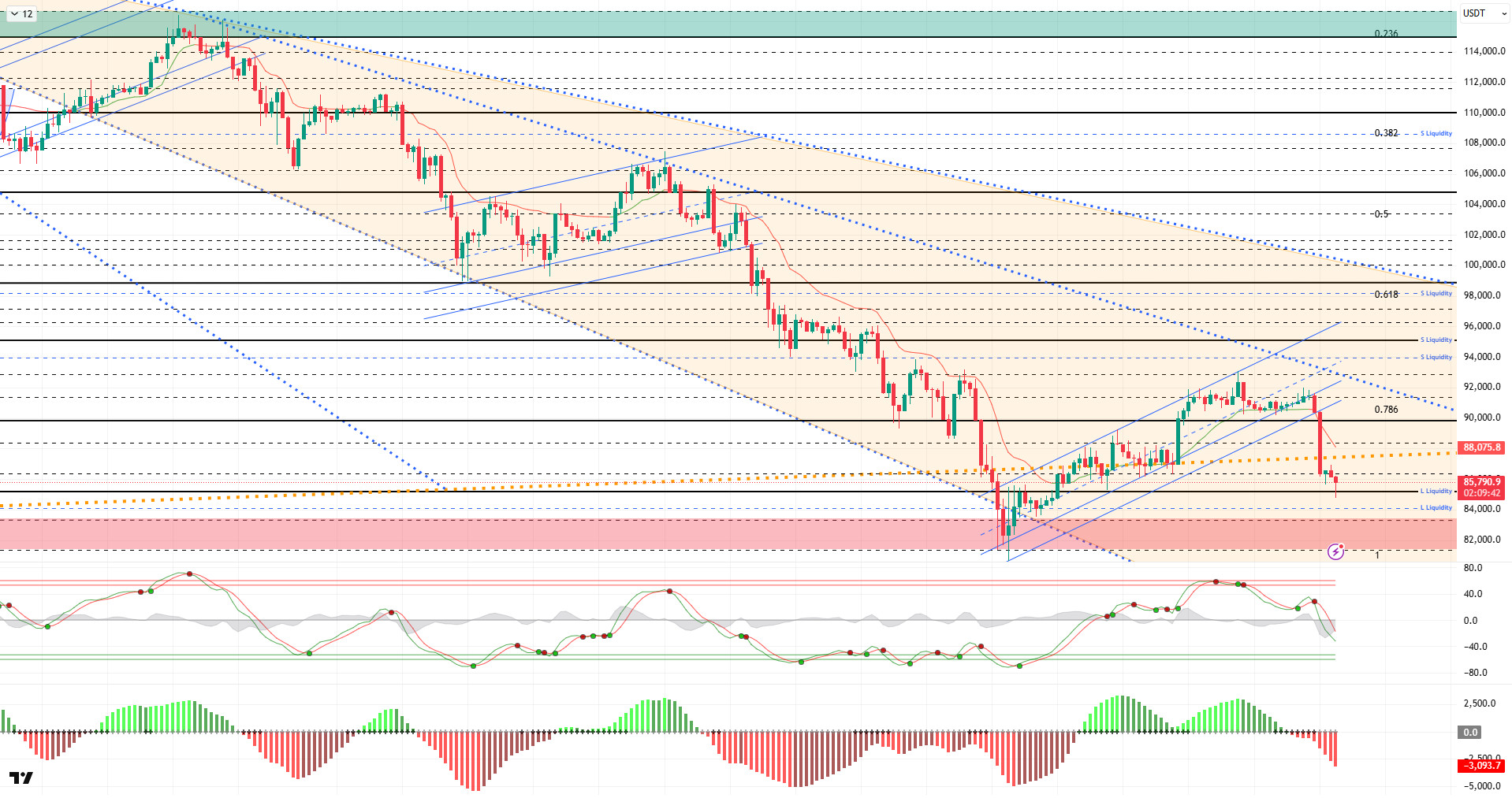 In summary, the momentum gained in BTC due to expectations of a Fed interest rate cut has come to an end. While the Bank of Japan’s tightening monetary policy messages put pressure on the markets, it was reported that Trump has nominated his candidate for Fed chair.Technically, the price managed to form an upward channel by increasing its upward momentum with support from the 80,500 bottom region and settled above the 90,000 band for a short time. However, increased selling pressure caused the price to turn downward again and lose the upward channel. Liquidity data indicates that target zones are regaining importance and that the market continues to seek equilibrium. After this stage, the price’s move back above the 87,000 level, where the major uptrend line passes, will be closely monitored, as a sustained gain above this level could create upward momentum. On the other hand, if selling pressure deepens, the 85,000 level emerges as a critical reference point. Losing this level is considered the final threshold that could strengthen the possibility of the price forming a double bottom pattern in the 80,000 range.