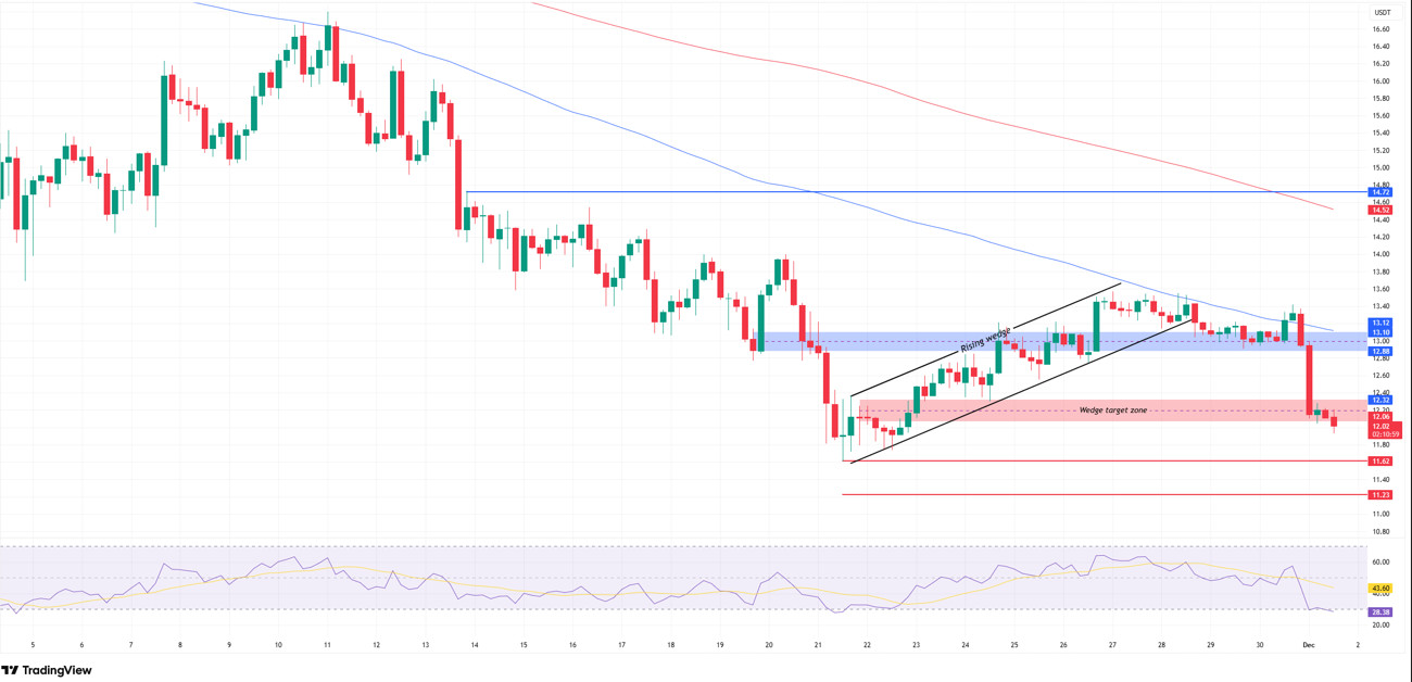 LINK, which entered an upward trend on November 21 with a strong buying reaction from the $11 level, maintained its short-term momentum by rising above the $13 threshold on November 27. However, after moving sideways in the $13 range for a while, the price faced selling pressure following the hammer formation at the $13.42 level and retreated back to the $12 support zone. One of the main reasons for the reaction seen in this region is that the rising wedge formation on the chart reached its target zone, and this point also coincides with the Fibonacci 0.786 retracement level of the upward wave.