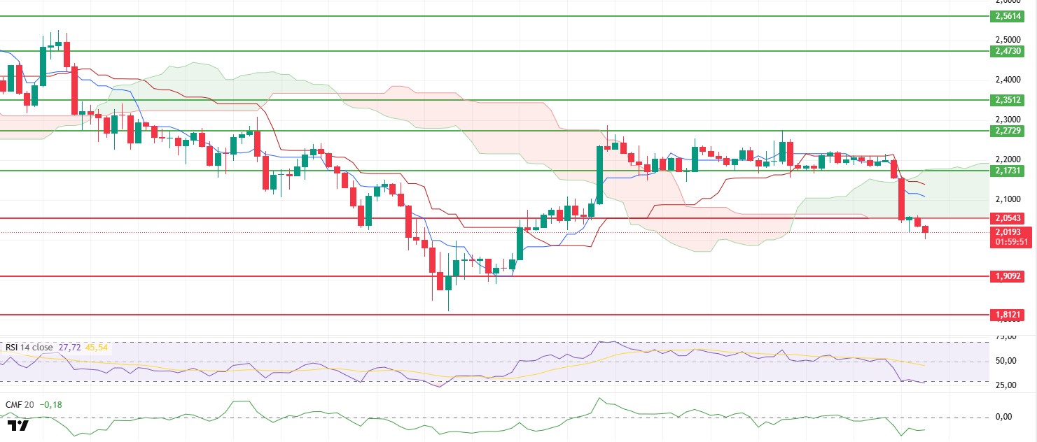 After losing the $2.05 support level during the day, the XRP price continued its downward trend and fell to the $2.02 level. This movement shows that the increased pressure after the weekly close is still strong and that buyers have not yet been able to respond effectively. The market has clearly taken on a weaker structure following the drop below the critical support zone.