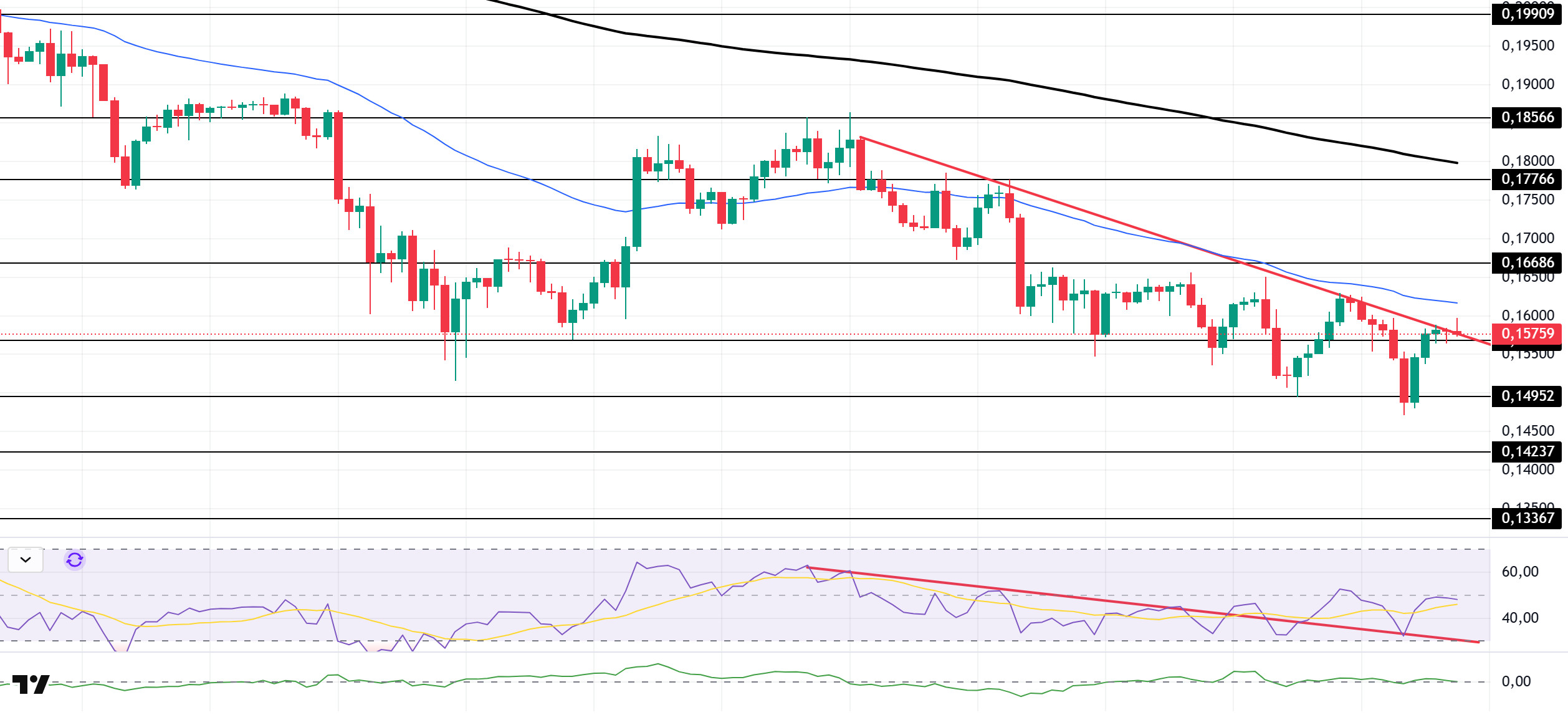 On the 4-hour chart, the 50 EMA (Exponential Moving Average – Blue Line) remained below the 200 EMA (Black Line). This indicates that a downtrend may begin in the medium term. The price being between the two moving averages indicates that the price is in a decision phase in the short term. On the other hand, the large difference between the two moving averages increases the potential for the asset to experience a horizontal or upward movement. The Chaikin Money Flow (CMF-20) is at a neutral level. Additionally, a decrease in cash inflows could push the CMF into negative territory. The Relative Strength Index (RSI-14) is near the neutral level in the negative zone. It also remained above the downward trend that began on November 10, indicating that buying pressure continues. In the event of potential increases driven by political developments, macroeconomic data, or positive news flow within the DOGE ecosystem, the $0.17766 level emerges as a strong resistance zone. Conversely, in the event of negative news flow, the $0.14237 level could be triggered. A decline to these levels could increase momentum and initiate a new wave of growth.