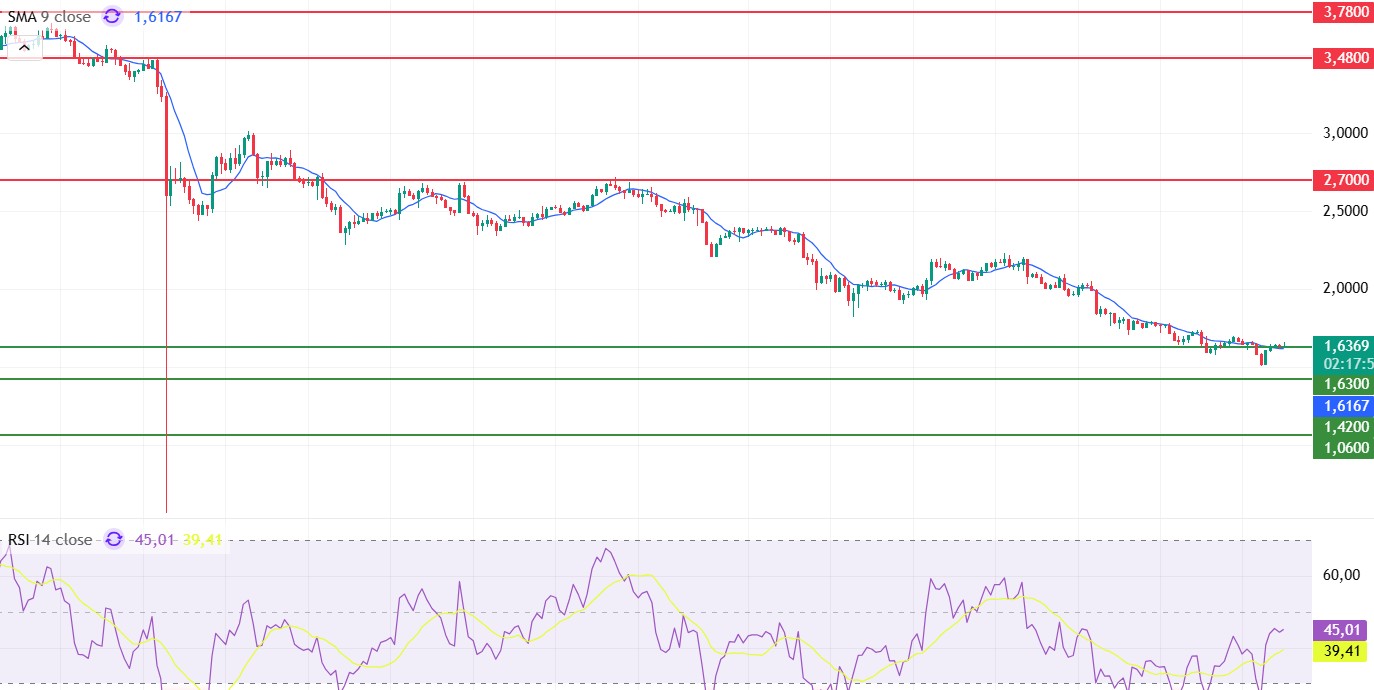 Looking at Sui’s technical outlook, we see that the price has been moving sideways around the $1.63 level on a 4-hour basis, influenced by fundamental developments. The Relative Strength Index (RSI) is currently in the range of 45.01 – 39.41. This range indicates that the market is trading close to the buy zone; a drop in the RSI to the 40.00 – 35.00 range could signal a potential buying point. If the price moves upward, the resistance levels of $2.70, $3.48, and $3.78 can be monitored. However, if the price falls to new lows, it could indicate deepening selling pressure. In this case, the support levels of $1.63, $1.42, and $1.06 come to the fore. Based on the trend line, a pullback to $1.42 appears technically possible. According to Simple Moving Averages (SMA) data, Sui’s average price is currently at $1.61. The price remaining above this level indicates that the current uptrend could technically continue.