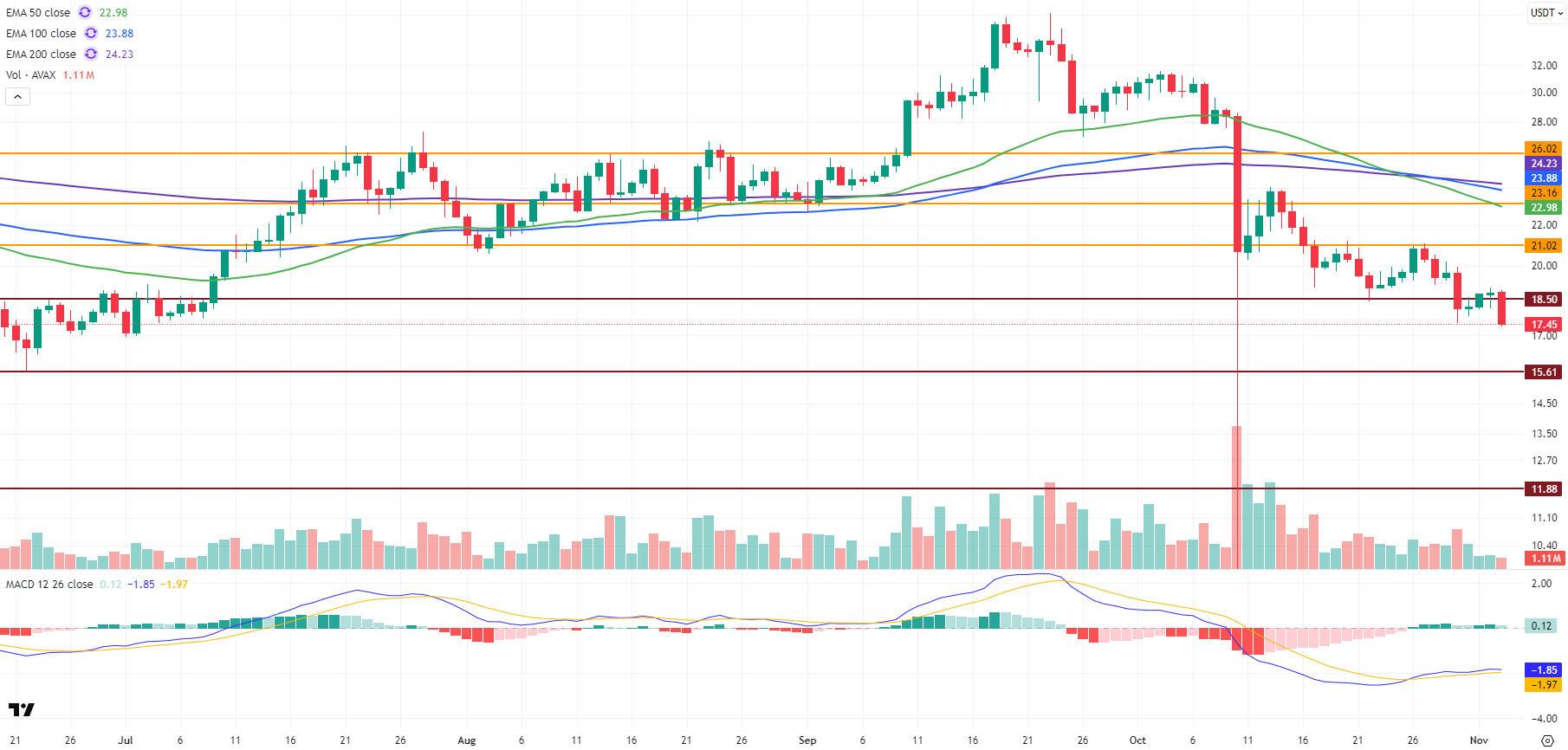 From a technical perspective, the $21 level continues to hold strong resistance for AVAX in the short term. If this level is broken and closes above it, the price could test resistance levels at $23.16 and $26.02. However, if the price fails to break through the EMA density in these areas, a sustained uptrend seems unlikely. In downward movements, the $18.50 level stands out as the first support. If there are closes below this level, selling pressure may increase and the price may retreat to the $15.61 and $11.88 support levels. In the overall outlook, the weak momentum on the MACD side and the fact that it remains below critical EMA levels indicate that the trend is still in negative territory. This situation may cause increased selling pressure on AVAX and accelerate the decline. AVAX closing below the $18.50 support level could reinforce this scenario. While upward attempts remain limited in the short term, for AVAX’s technical outlook to shift back to the positive side, it needs to remain above $21 and show a significant increase in trading volume.