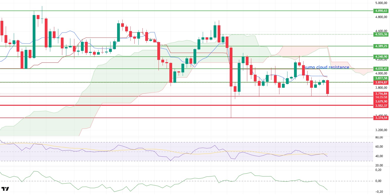 The Ethereum price generally followed a weak trend last week. Starting the week by rising to the lower band of the cloud at the $4,240 level, the price received strong rejection from this area and fell to the $3,679 support level throughout the week under the influence of selling pressure. The price is currently trying to hold on to this support zone. However, the current technical structure indicates that the downtrend has not yet ended.