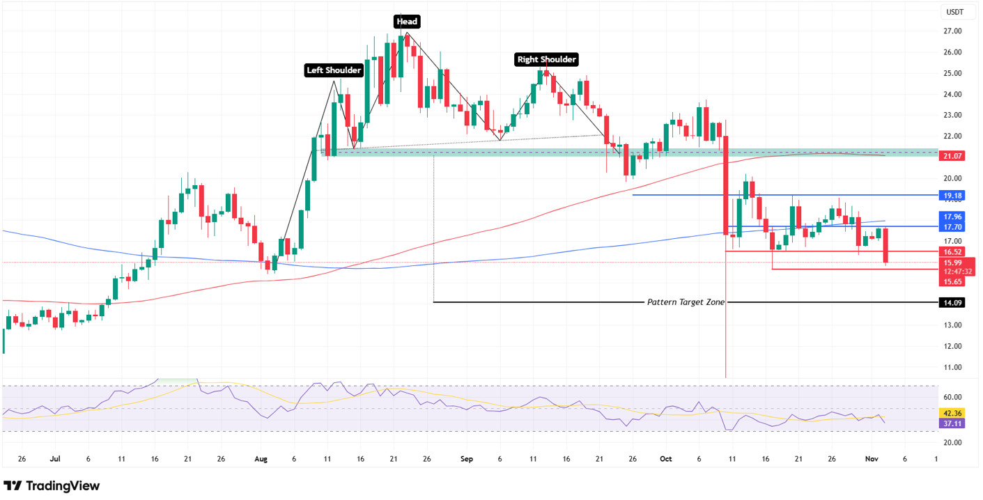 Link formed a Head and Shoulders pattern with the decline on October 10 and showed approximately 3 weeks of sideways movement after the pattern support break. Then, with the price falling below the 200-day moving average, we see that selling pressure has increased and a downtrend towards the pattern target has begun. Although we expect the price to rebound from our first support level of $16.52 in the short term, the current outlook shows that a breakout has occurred.