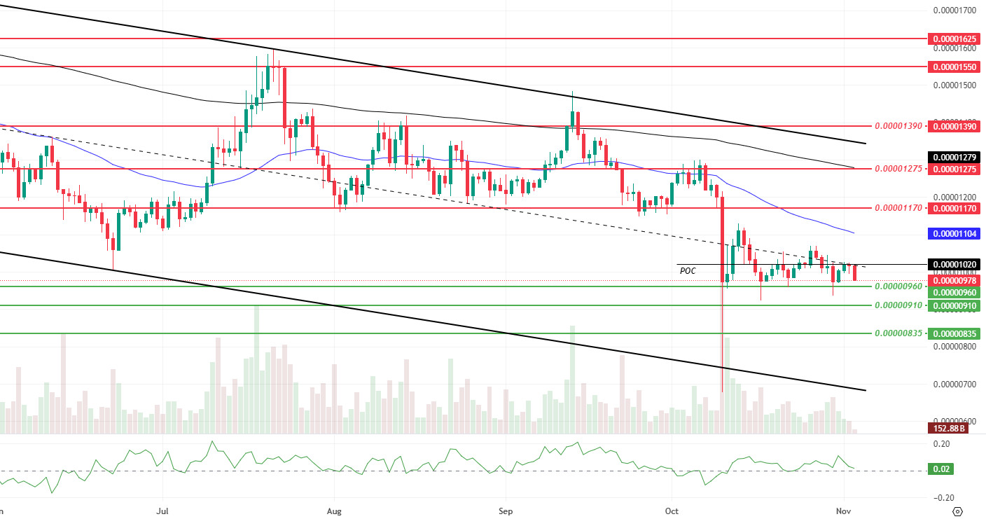 From an upward perspective, closes above $0.00001020 will be the first supportive signal. Subsequently, settling above the EMA 50 around $0.00001104 and volume-backed retracement of intermediate resistance levels could strengthen the movement. If these conditions materialize, $0.00001170 and $0.00001275 could be monitored as intermediate targets. Below, if the price cannot hold the $0.00000960 level, it could pave the way for accelerated weakness. In this case, $0.00000910 could be retested. Below that, $0.00000835 is tracked as a wide-band support. In summary, the price maintains its tight range around the POC thresholds. As long as the price remains below the EMA 50 and EMA 200, upward attempts may retain their corrective nature. For sustainability, a breakout from the channel requires a significant recovery in volume and volatility. (EMA200: Black line, EMA50: Blue line)