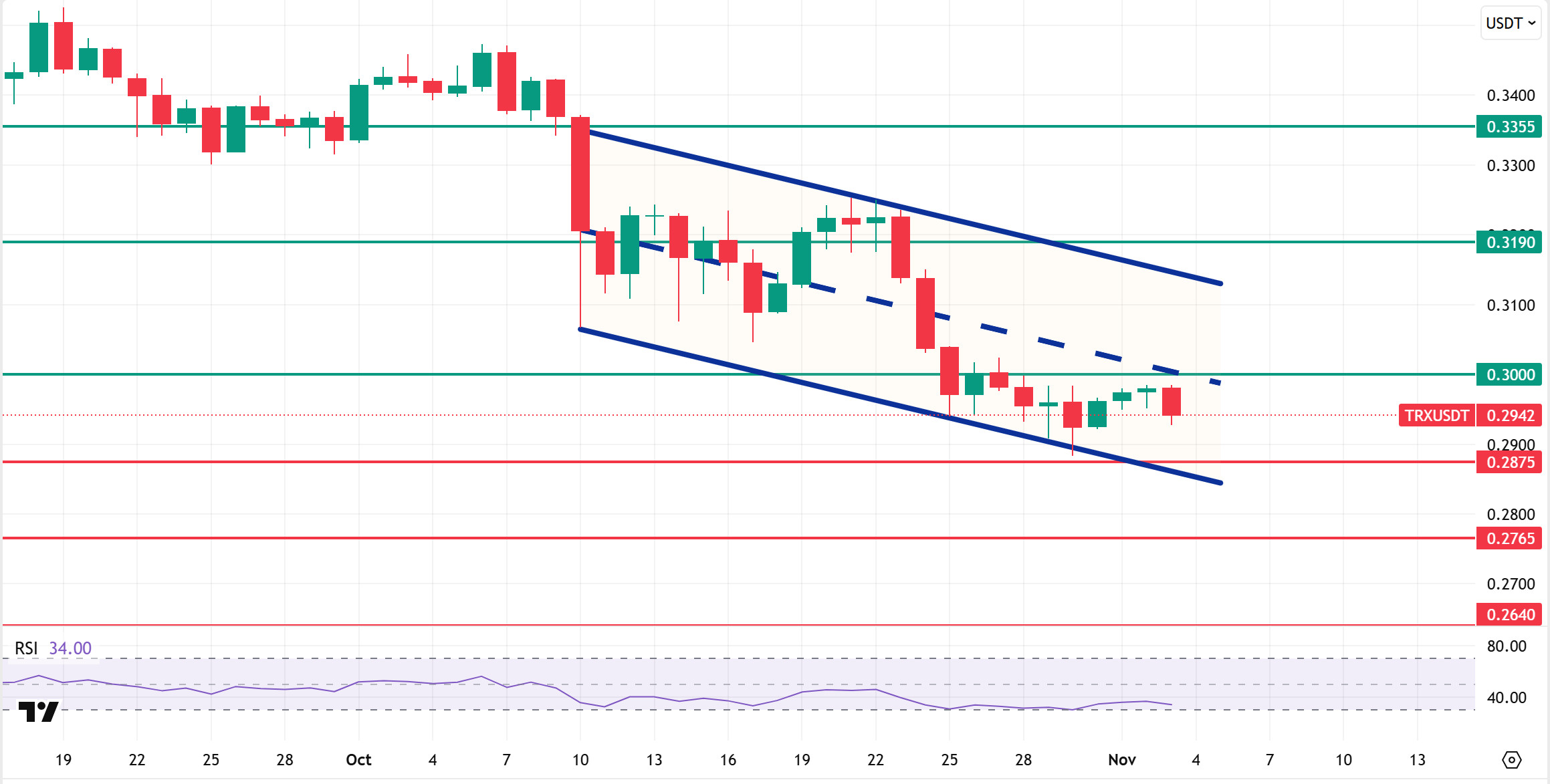 Technically speaking, TRX started last week at 0.3003 and closed the week at 0.2980, falling approximately 1% over the course of the week. Thus, TRON, which has completed its fourth consecutive week of decline, has a market value of $28.2 billion. Currently trading at 0.2942, TRX is just below the middle band of the bearish channel on the daily chart and is hovering near the 0.3000 resistance level. The Relative Strength Index (RSI) value is observed to be very close to the oversold zone at 34. Considering its position within the bearish channel and the RSI indicator, the TRX price may be expected to rise. This indicates that it may want to move towards the upper band of the channel. In such a case, it may test the 0.3000 resistance. If it closes above the 0.3000 resistance level on a daily basis, it may test the 0.3190 resistance level. If it fails to close above the 0.3000 resistance level on a daily basis and selling pressure increases in the market, it may decline due to potential selling from this area. In such a case, it may test the 0.2875 support level. The 0.2640 level is being monitored as a critical support point on the daily chart. Staying above this level could maintain the upward trend, while closes below it could lead to increased selling pressure and deeper downward price movements.