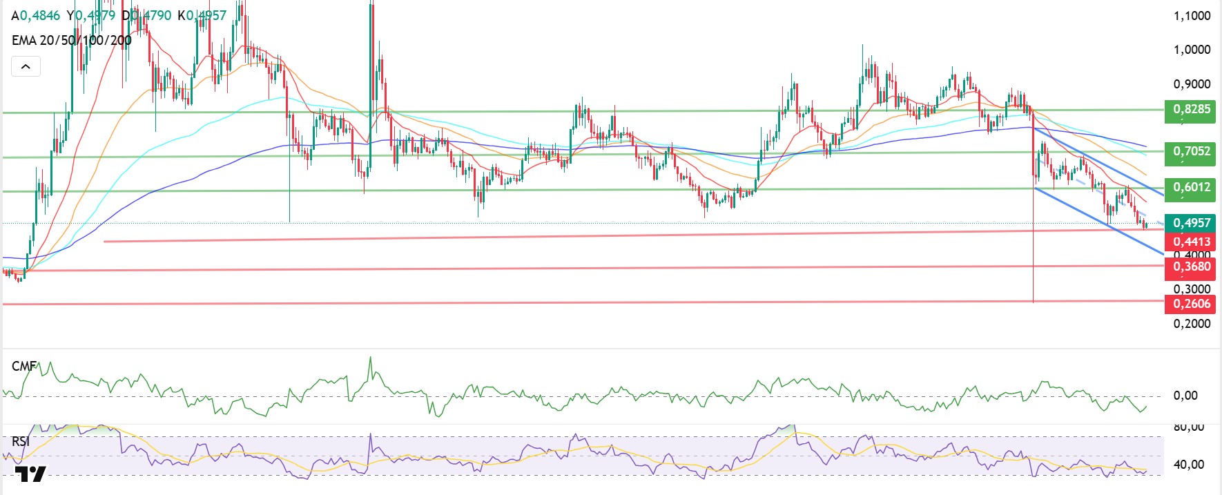 Technically speaking, ADA, which has been in a downtrend since last week, could end its falling channel if it pulls back from the $0.5055 level. If it closes above this level, the $0.5957 level could be monitored as the first resistance point. If the price breaks above the 20-day Exponential Moving Average (EMA 20 – Red Line) level, it is expected to close above the 50-day Exponential Moving Average (EMA 50 – Blue Line). If the price falls as a result of macroeconomic data expected to be announced this week and statements made by FED members, the first support point at the $0.4413 level can be monitored. If it closes below this level, the $0.3680 level can be monitored. The Relative Strength Index (RSI) continues in the sell zone, falling to 36, while the Chaikin Money Flow (CMF-20) remains at -0.10 levels, signaling limited money inflows.