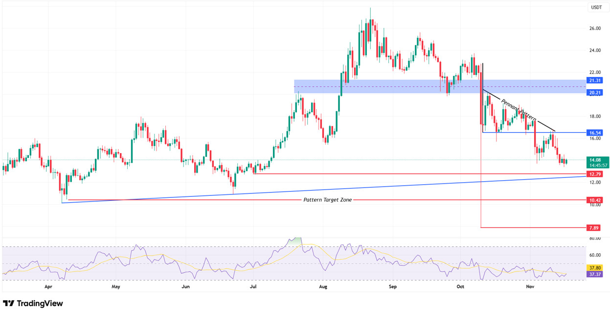 On November 3, Link broke below the $16.54 level, completing a technical breakout in a bearish flag formation. Although the price attempted to move back up afterwards, this reaction failed to break above the $16.54 level, remaining merely a breakout confirmation and facing strong selling pressure.