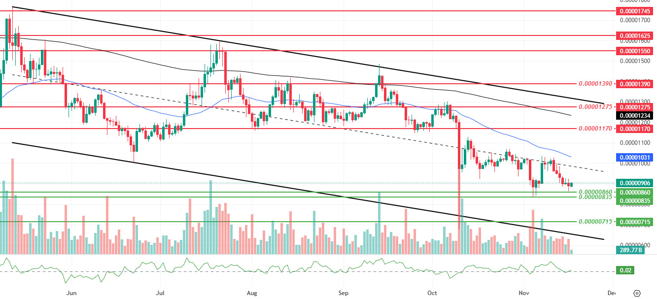 From an upward movement perspective, $0.00001170 stands out as the first significant threshold; Closing above this level and subsequently retaking the $0.00001275 and $0.00001390 resistance levels with increasing volume could carry the rebound towards the upper band of the descending channel and pave the way for a recovery approaching the EMA 50 and EMA 200. In this scenario, the nature of the movement could evolve from being “just a short-term short squeeze” to a stronger correction structure. Below, failure to hold the $0.00000860 support could accelerate the decline and pave the way for a test of the $0.00000835 band; below this level, $0.00000715 could act as a broader and more medium-term support. In summary, while the price continues to trade below the EMA 50 and EMA 200, the broken support levels and weakening volume structure indicate that upward attempts are still corrective in nature; a sustained change in direction requires both a recovery in volume and volatility and a clear break above the descending channel structure. (EMA200: Black line, EMA50: Blue line)