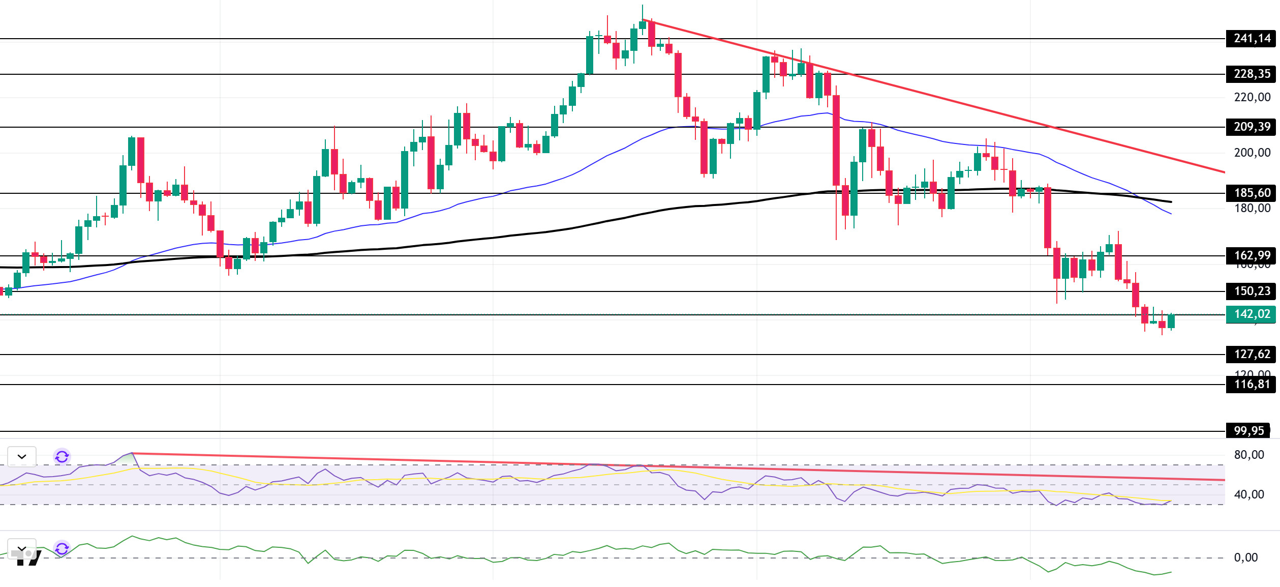 The SOL price experienced a pullback on the daily chart this week. The asset remained in the lower region of the downtrend that began on September 18. The price tested the 200 EMA (Black Line) moving average and the strong support level of $185.60 as support but failed to hold there, deepening its decline. It then tested the strong resistance level at $162.99 but failed to hold above this level, continuing its decline. Currently testing the $141.80 level, the price may continue to decline if it fails to break above this level. If an uptrend begins, it may test the 50 EMA (Blue Line) moving average as resistance.