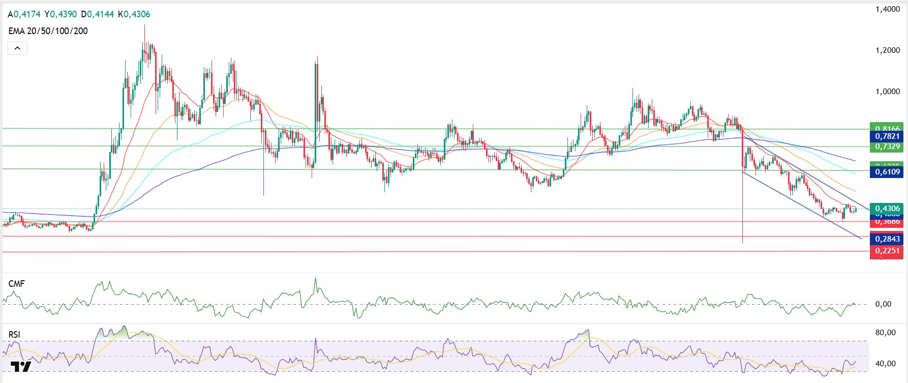 Technically, the ADA price continues to trade below the 20-day and 50-day Exponential Moving Averages (EMA 20 – Red Line) (EMA 50 – Orange Line). If the price rises to the resistance point of the downtrend at the $0.6203 level, the second resistance point at the $0.7329 level can be followed. These levels indicate that ADA buyers are willing to buy at higher prices, showing that buyer pressure is increasing over time. A retest of this region could play a critical role in completing the downward channel. If the price breaks above the 20-day Exponential Moving Average (EMA 20 – Red Line), it is expected to close above the 50-day Exponential Moving Average (EMA 50 – Blue Line). While the Relative Strength Index (RSI) continues to hover near the buy zone at 44 levels, the Chaikin Money Flow (CMF-20) remains at 0.01 levels, indicating that the price is in the sell zone. If the price falls as a result of the macroeconomic data expected to be announced this week and the statements to be made by US President Trump, the important levels we will follow are the bottom of the downtrend at $0.3732. In the event of closes below this level, the support level can be followed in the $0.3030 to $0.2297 band.