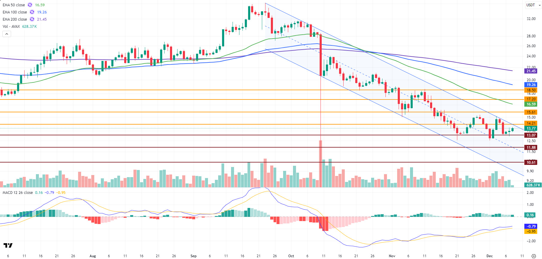 AVAX performed weakly last week, mirroring the volatile market conditions. Starting the week at $13.71, AVAX tested the upper band of the bearish channel on the daily chart during an upward attempt but faced selling pressure in this region and failed to build strong momentum. After the reaction from the upper band of the bearish channel, AVAX tested the support level of $13.07 ( ) several times during its decline but failed to break it. Reaction buying from this area pushed the price back up. With no strong momentum yet, the gains remained limited, and the week closed at $13.49. AVAX, which lost approximately 1.6% on a weekly basis, started the new week with a slightly positive outlook. Despite developments in its ecosystem, AVAX’s price movements continue to follow the general recovery-decline cycle of the cryptocurrency market.