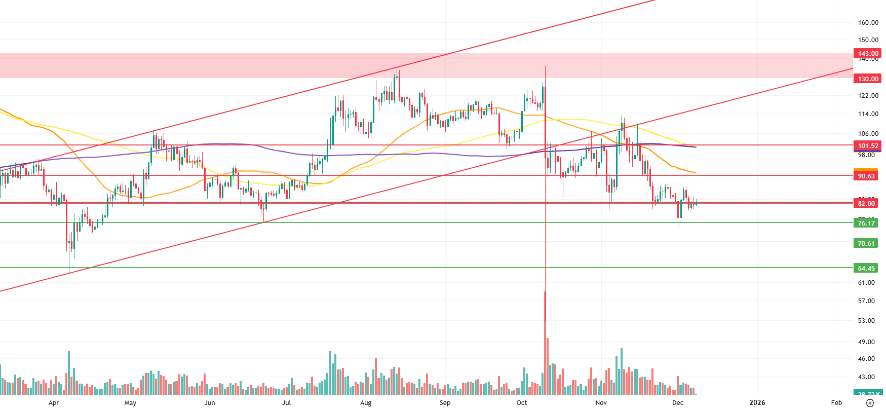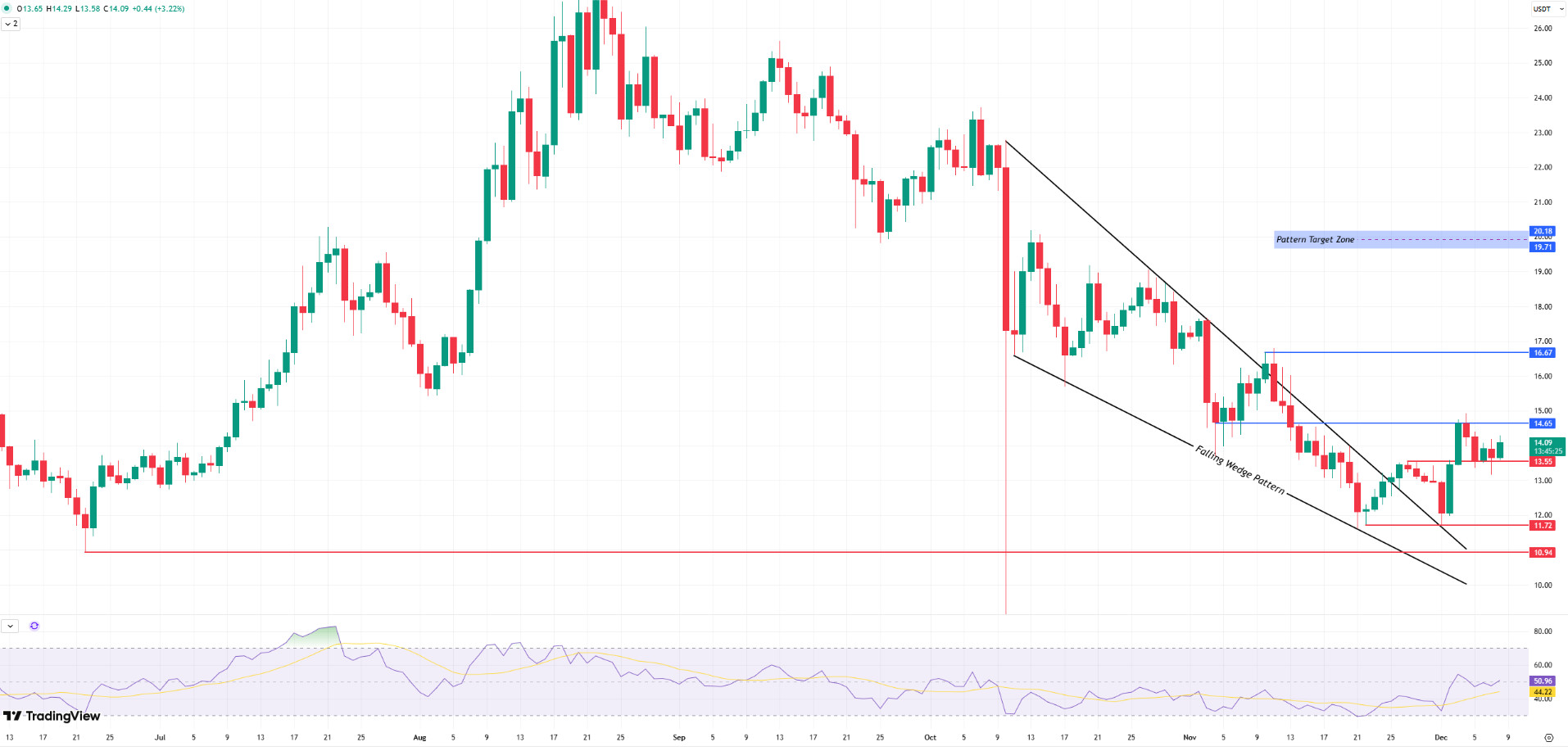 In the current situation, the first significant barrier to the continuation of the upward movement is the $14–15 range. A daily close above this range will both strengthen the rising bottom–rising top structure and increase price stability by confirming the formation structure. If this scenario materializes, the first target could be the $16.67 level. Subsequently, we could see a strong upward momentum towards the $19–20 target zone indicated by the falling wedge pattern.