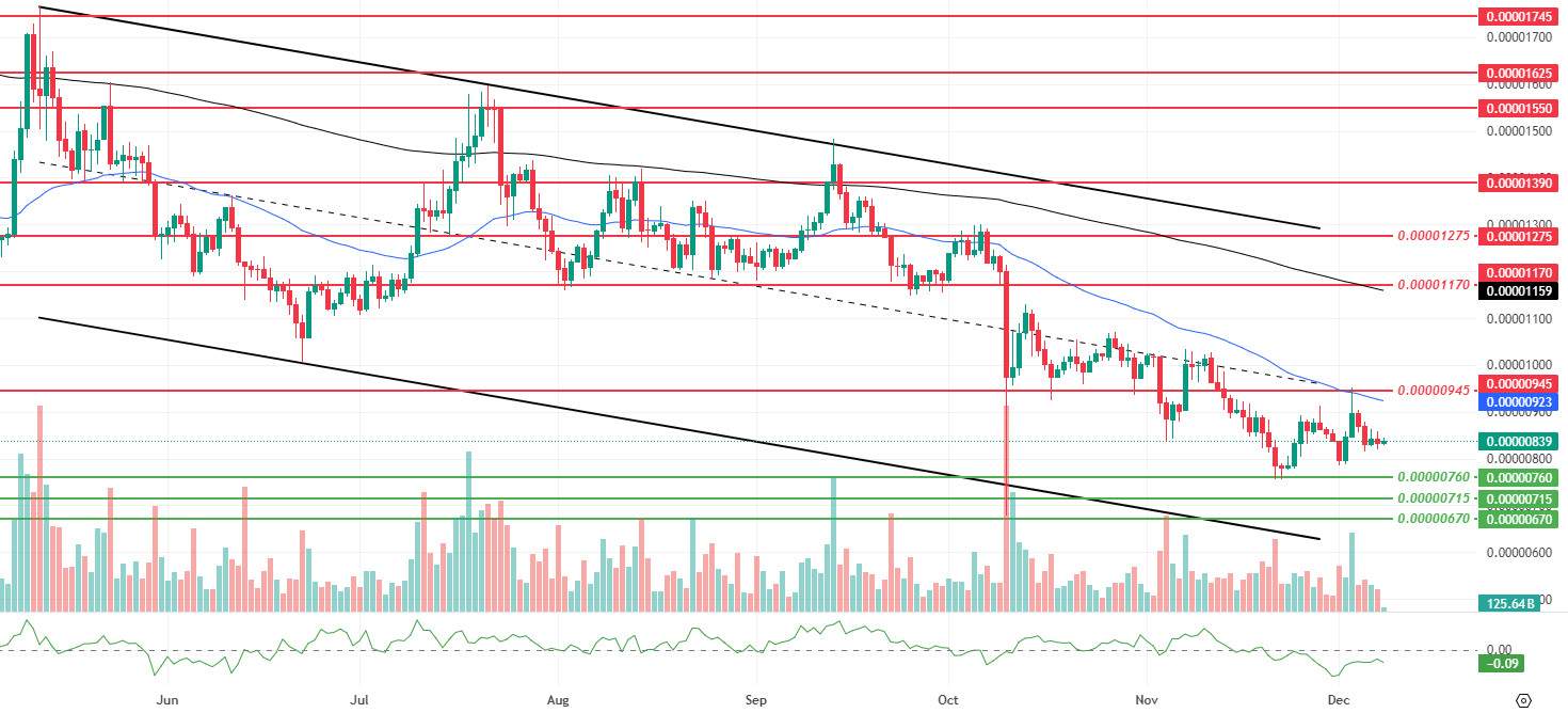 In terms of upward attempts, the level passing through $0.00000945 maintains its position as the first critical threshold, as it corresponds to the middle band of the descending channel and is also the point where the last rebound attempt was rejected. Without volume-supported and consecutive closes above this level, it seems difficult for a more meaningful and lasting recovery scenario towards the resistance zones at $0.00001170 and $0.00001275 to gain momentum. On the downside, the zone passing through $0.00000760 continues to be the main technical reference support. As long as it stays above this level, the current picture can be interpreted as a rebound process fluctuating between the lower and middle bands of the descending channel, but with pressure still favoring sellers. Conversely, if declines below the support at $0.00000760 become permanent and the Chaikin Money Flow (CMF) indicator deepens further into negative territory, it would not be surprising to see the areas at $0.00000715 and $0.00000670 come back into focus. If the positive reaction in volume persists alongside momentum and the price continues to hold above the support level at $0.00000760, the scenario of a gradual reaction within the descending channel can be considered to remain on the table.