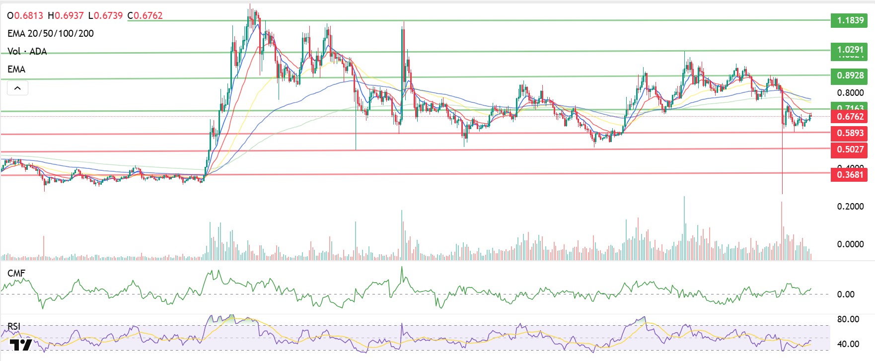 Technically speaking, the ADA price experienced a bullish RSI divergence by forming an Inverse Head and Shoulders pattern. The price managed to rise above $0.6766 and reach the 20-day Exponential Moving Average (EMA 20 – Red Line) level. The price is preparing to close above the 50-day Exponential Moving Average (EMA 50 – Blue Line). If there is a confirmed close above $0.7163, the first target could be $0.8928, and if momentum continues, the $1.0291 level could be our first resistance level in the wide band range. The Relative Strength Index (RSI) continues to move near the sell zone, falling to 40 levels, while the Chaikin Money Flow (CMF-20) has fallen to 0.11 levels, indicating potential for a sell-off. The decrease in money inflows may keep the CMF in negative territory, and the uncertainty between the two indicators could signal a sell-off. With macroeconomic data to be released this week or positive news regarding the Cardano ecosystem, the $0.8928 level may emerge as our strong resistance point. If the decline begins, the $0.5897 level will be the important support level we will follow.