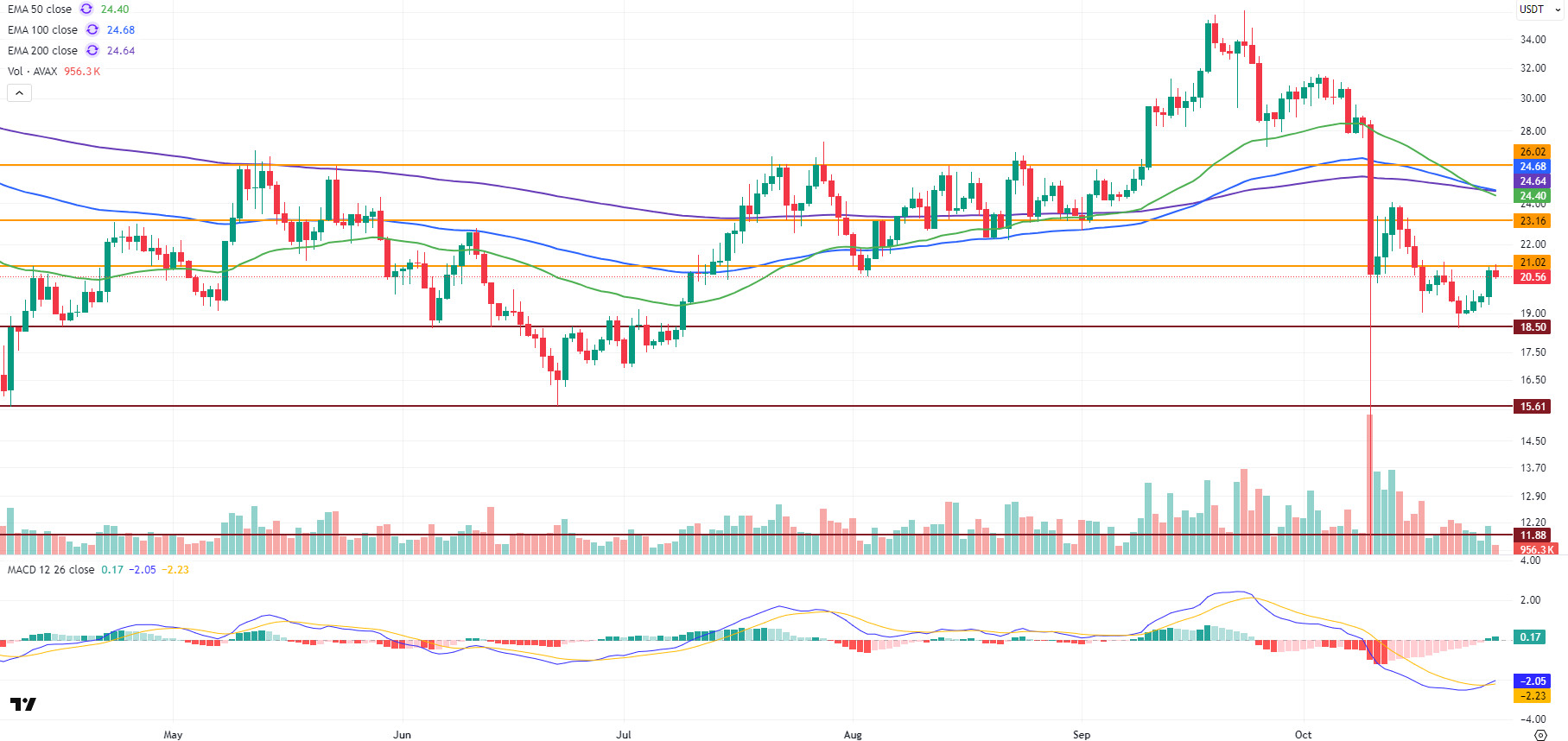 From a technical perspective, AVAX tested the $21.02 resistance level during its rise yesterday and today, but experienced a decline due to selling pressure at this level. It is important for AVAX, which continues to trade below the $21.02 level, to remain above this level for the uptrend to continue. If this level is broken, the $24-25 resistance zone, where critical EMA levels are concentrated, and the $26.02 resistance level emerge as the strongest resistance zones in the short term. Conversely, in a downward movement, the $18.50 level is the first support position. If there are closes below this level, selling pressure could deepen, and AVAX could retreat to the $15.61 and $11.88 levels. In the overall picture, while the MACD indicator is generating positive signals, the EMA structure remains in negative territory. This indicates that a recovery process has begun in the short term, but the overall trend has not yet fully reversed. If trading volumes increase and there are closes above $21, a gradual upward trend for AVAX is expected to strengthen.