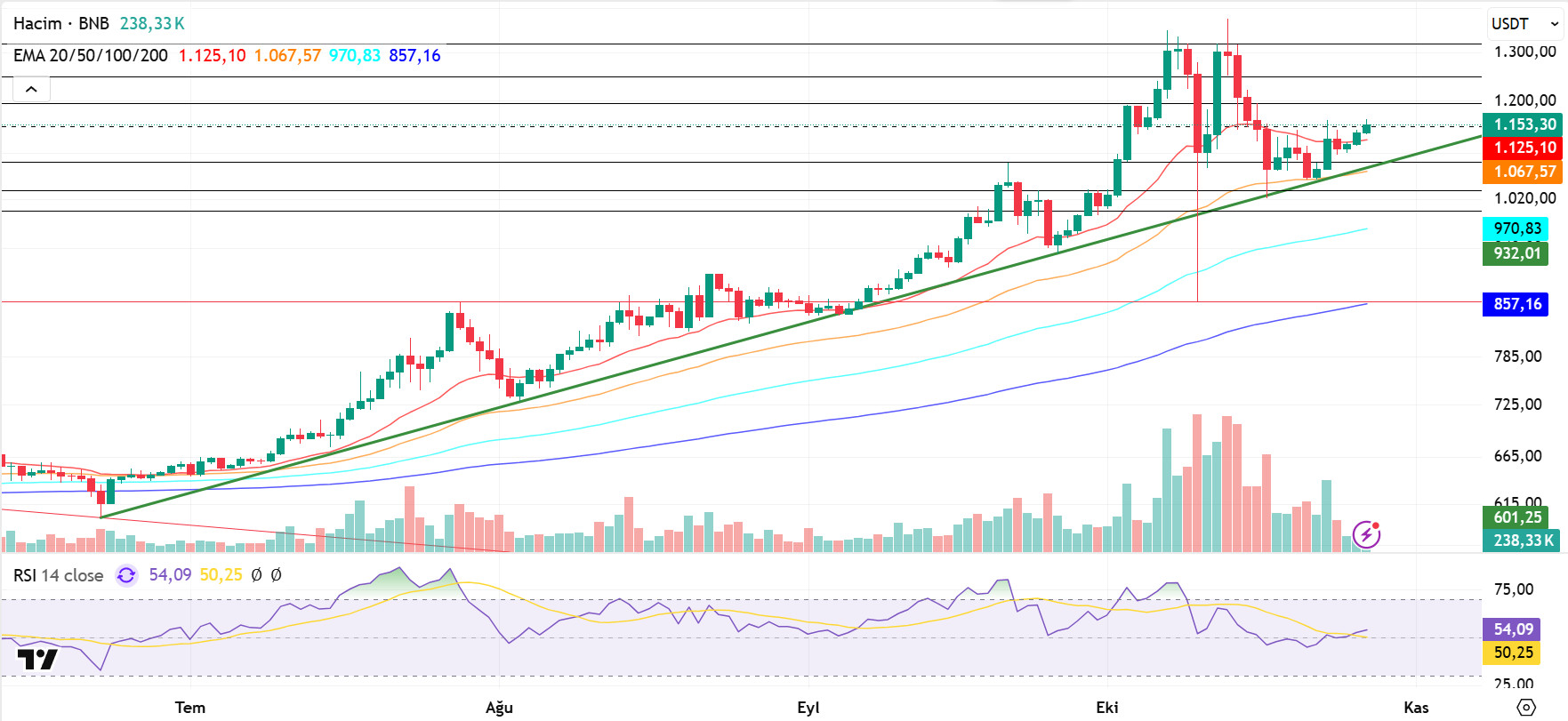 Within the current outlook, if buying appetite is maintained, BNB is expected to test the $1,200 resistance level in the first stage. If this level is broken, the price could move towards the $1,250 and $1,320 levels. On the other hand, if selling pressure increases, the price may retreat back to the $1,100 support level. If this level is broken downward, the $1,050 and $1,000 levels emerge as critical areas to monitor.
