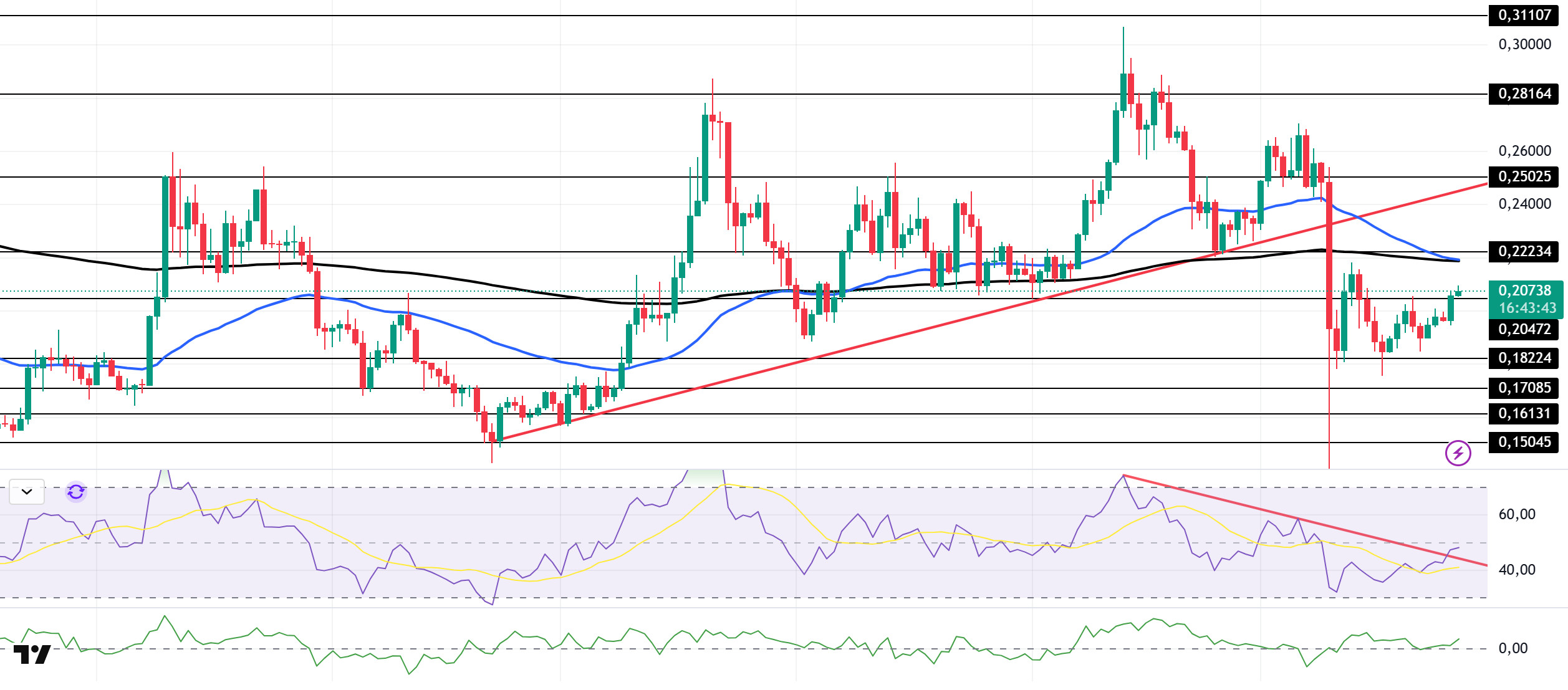 The asset is trading between the 50 EMA (Exponential Moving Average – Blue Line) and 200 EMA (Black Line) moving averages, indicating that the asset is in a decision phase. Furthermore, the 50 EMA remaining above the 200 EMA indicates that a “golden cross” formation is continuing from a technical perspective. This shows that the potential for an uptrend in the medium term continues. The RSI (14) has risen from negative to positive levels. At the same time, the indicator remained below the downward trend line that began on July 22. This indicates that buying pressure is not strong. The Chaikin Money Flow (CMF-20) remains in positive territory; however, a decrease in money inflows could push the CMF-20 indicator into negative territory. If macroeconomic data remains positive and developments in the ecosystem continue to be favorable, the first major resistance level of $228.35 could be retested. Conversely, in the event of potential negative news flow or deterioration in macro data, the $185.60 level could be monitored as a potential buying opportunity.