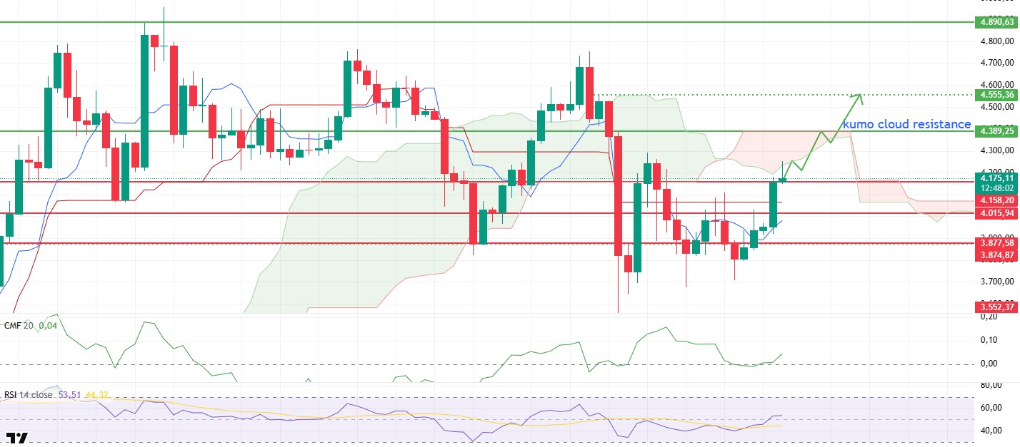 Looking at price movements, ETH started a strong recovery after retreating to the $3,700 level last week. The price tested the $4,000 level in the middle of the week but struggled to break through this area. The break of the $4,158 resistance level over the weekend, driven by increased buyer demand, signaled a short-term shift in the technical outlook back to positive territory. This move indicates that the market has begun targeting the upper band of the $4,389 cloud.