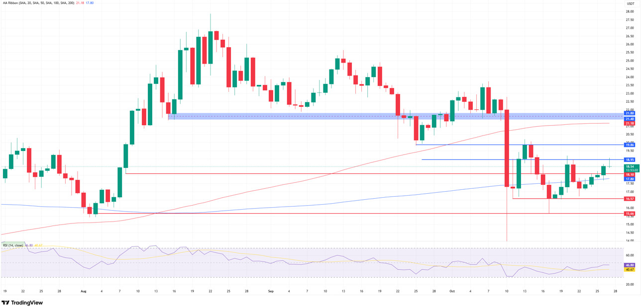 Technically speaking, after hitting a low on October 17, the price rose by approximately 23% to above the $19 level. Although we saw a slight decline afterwards, it attempted to gain a positive outlook by forming a rising low. Despite accompanying the positive price movements in the market on October 27, we are seeing another pullback in the price due to the selling pressure encountered at the $19 level. The $19 level is critically important for us here. A 4-hour close above this level, followed by a possible daily close, could confirm the rising bottom and top structure, signaling the start of a new uptrend and strengthening the $21 scenario.