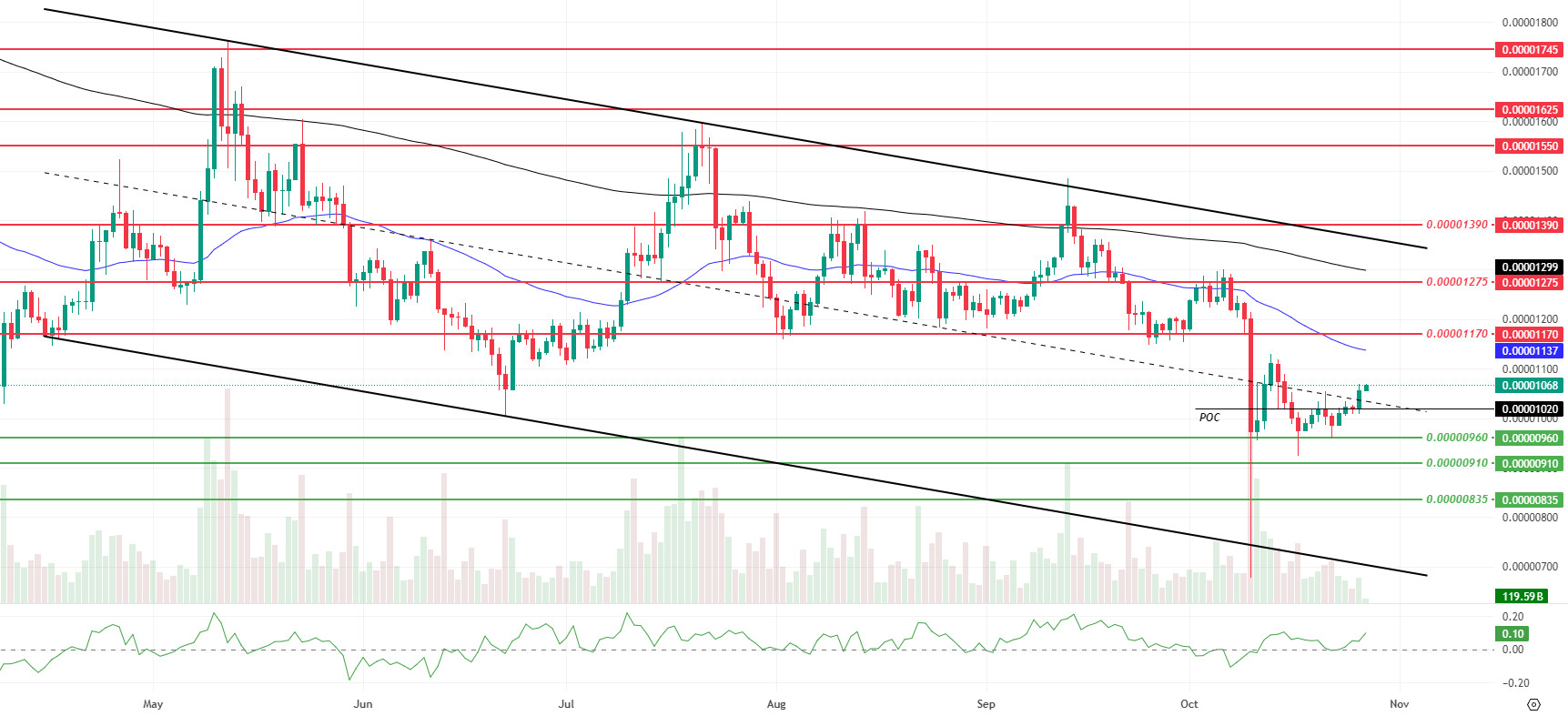 In terms of upward attempts, closes above $0.00001070 could be supportive, followed by settling above the EMA 50 around $0.00001173 and volume-driven retakes of intermediate resistance levels could strengthen the process. If these conditions are met, 0.00001170 and 0.00001275 could emerge as intermediate targets, followed by the 0.00001319 to 0.00001340 band around the EMA 200 and 0.00001390. Below 0.00001020, a break could accelerate the decline, potentially retesting 0.00000960. Below that, 0.00000910 and 0.00000835 could act as broad support levels. In summary, the price maintains a tight appearance around the POC thresholds. As long as the trend continues below the EMA 50 and EMA 200, upward attempts may retain their corrective character. A significant recovery in volume and volatility could be beneficial for sustainability. (EMA200: Black line, EMA50: Blue line)