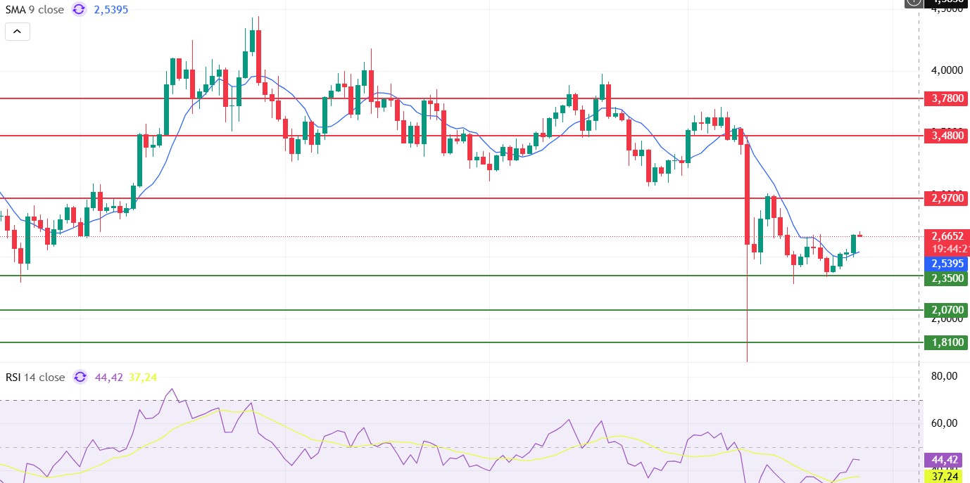 Looking at Sui’s technical outlook following recent developments, we see that the price has been moving sideways at around $2.66 on a weekly basis, influenced by fundamental developments. The Relative Strength Index (RSI) is currently in the range of 44.42 – 37.24. This range indicates that the market is trading close to the buy zone; a drop in the RSI to the 35.00 – 40.00 range could signal a potential buying point. If the price moves upward, the resistance levels of $2.97, $3.48, and $3.78 can be monitored. However, if the price falls to new lows, it could indicate that selling pressure is intensifying. In this case, the support levels of $2.35, $2.07, and $1.94 come to the fore. Based on the trend line, a pullback to $1.81 appears technically possible. According to Simple Moving Averages (SMA) data, Sui’s average price is currently at $2.53. If the price remains above this level, it signals that the current uptrend could technically continue.